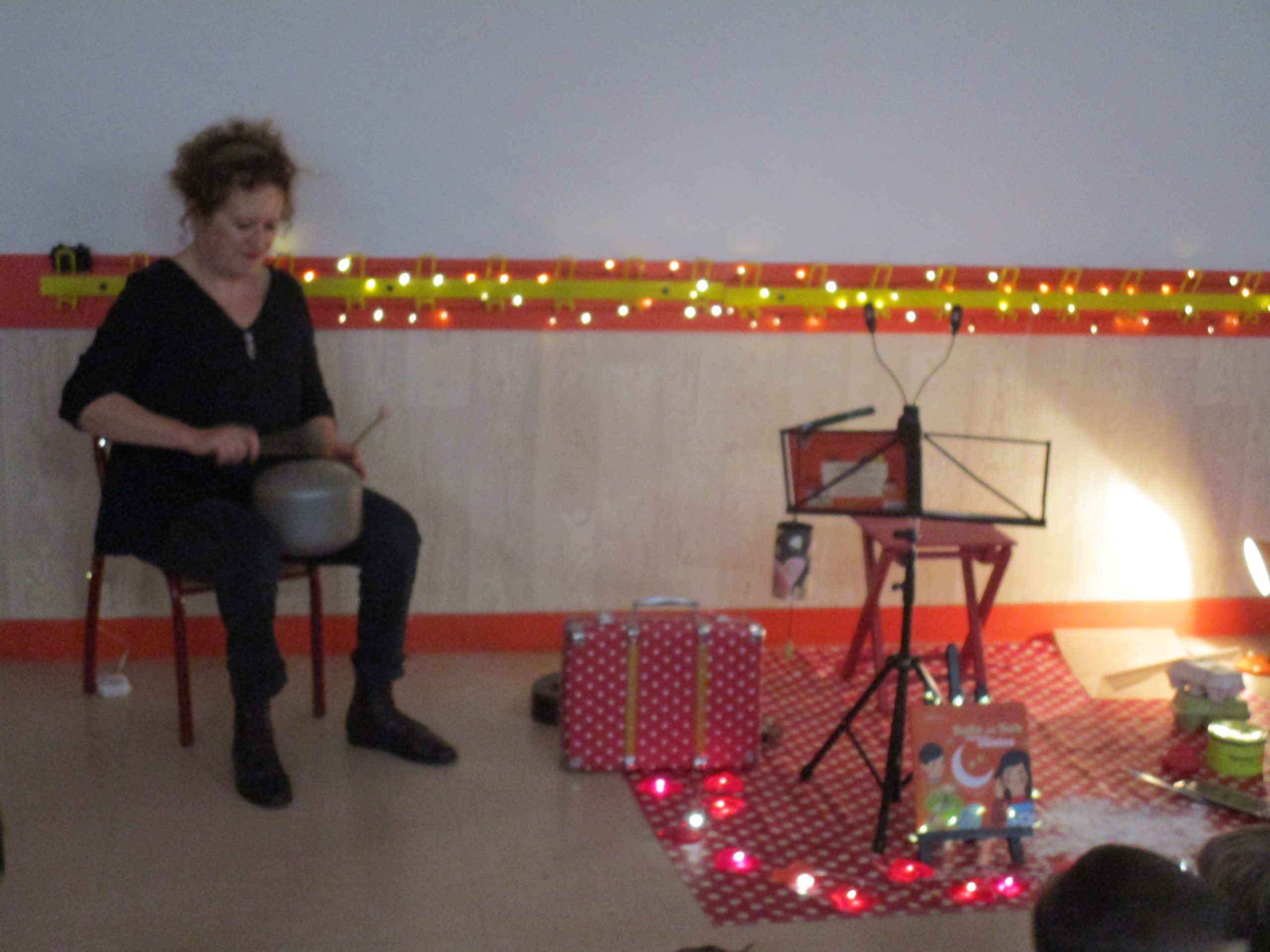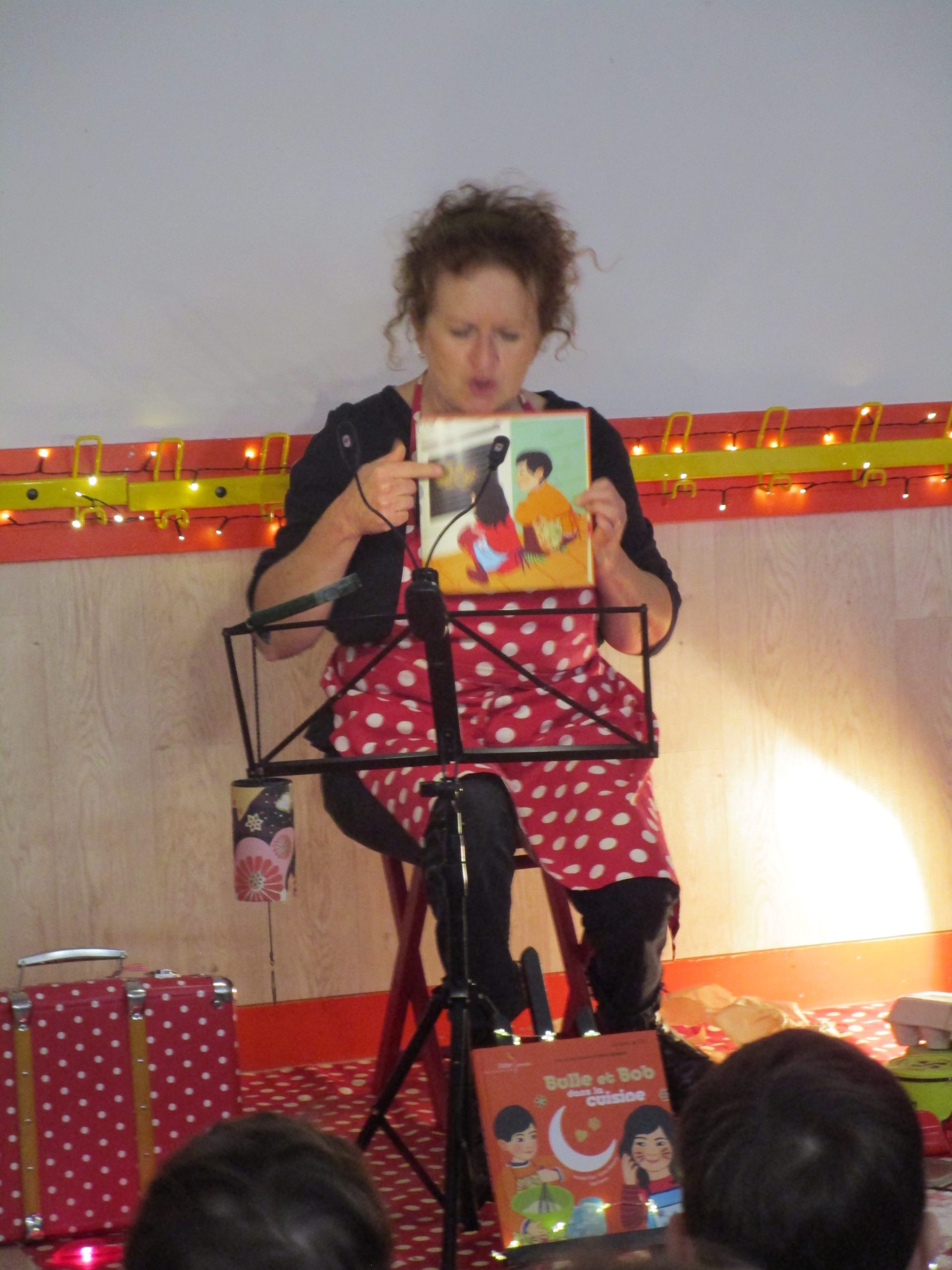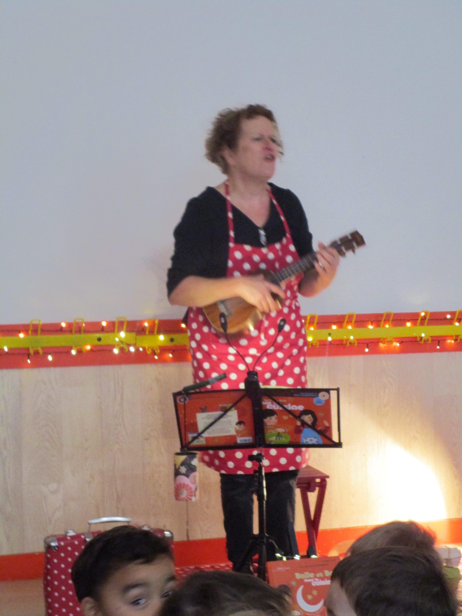 Quelle chance ! Nous rencontrons la sympathique auteure des albums de Bulle et Bob : Natalie Tual. C’est elle qui a créé « Bulle et Bob dans la cuisine » que nous avons beaucoup chanté ces derniers temps. Elle en assure aujourd’hui la lecture chantée. Pour son orchestration, elle utilise de vrais instruments de musique (ukulélé, kazou) mais aussi les sons produits par des « instruments » peu habituels : semoule dans une boîte en fer ou bocal rempli de pâtes qu’elle secoue en guise de maracas ; cuillers en bois utilisées comme des claves ; papier sulfurisé qu’elle manipule allègrement… Quel talent !!!