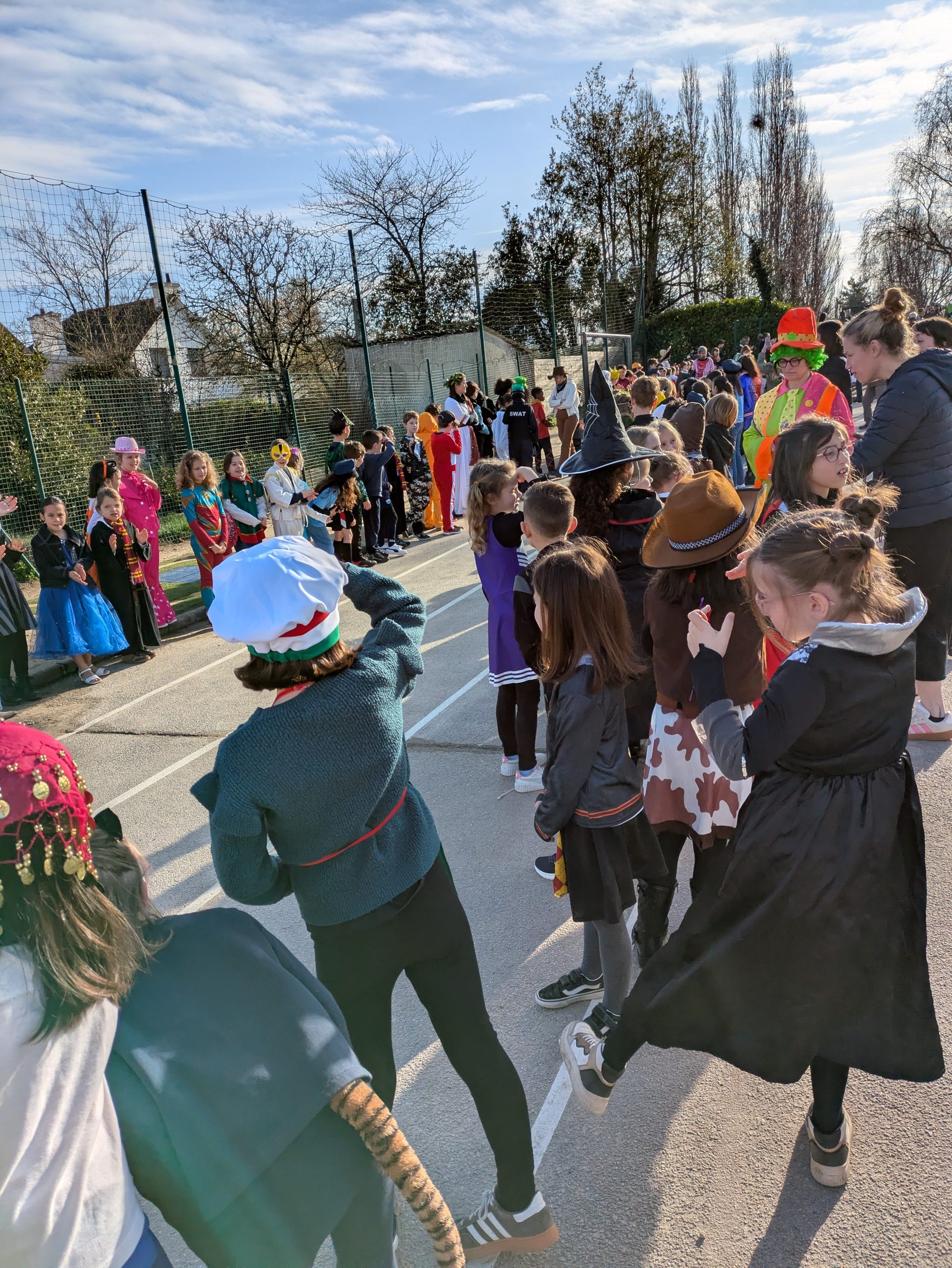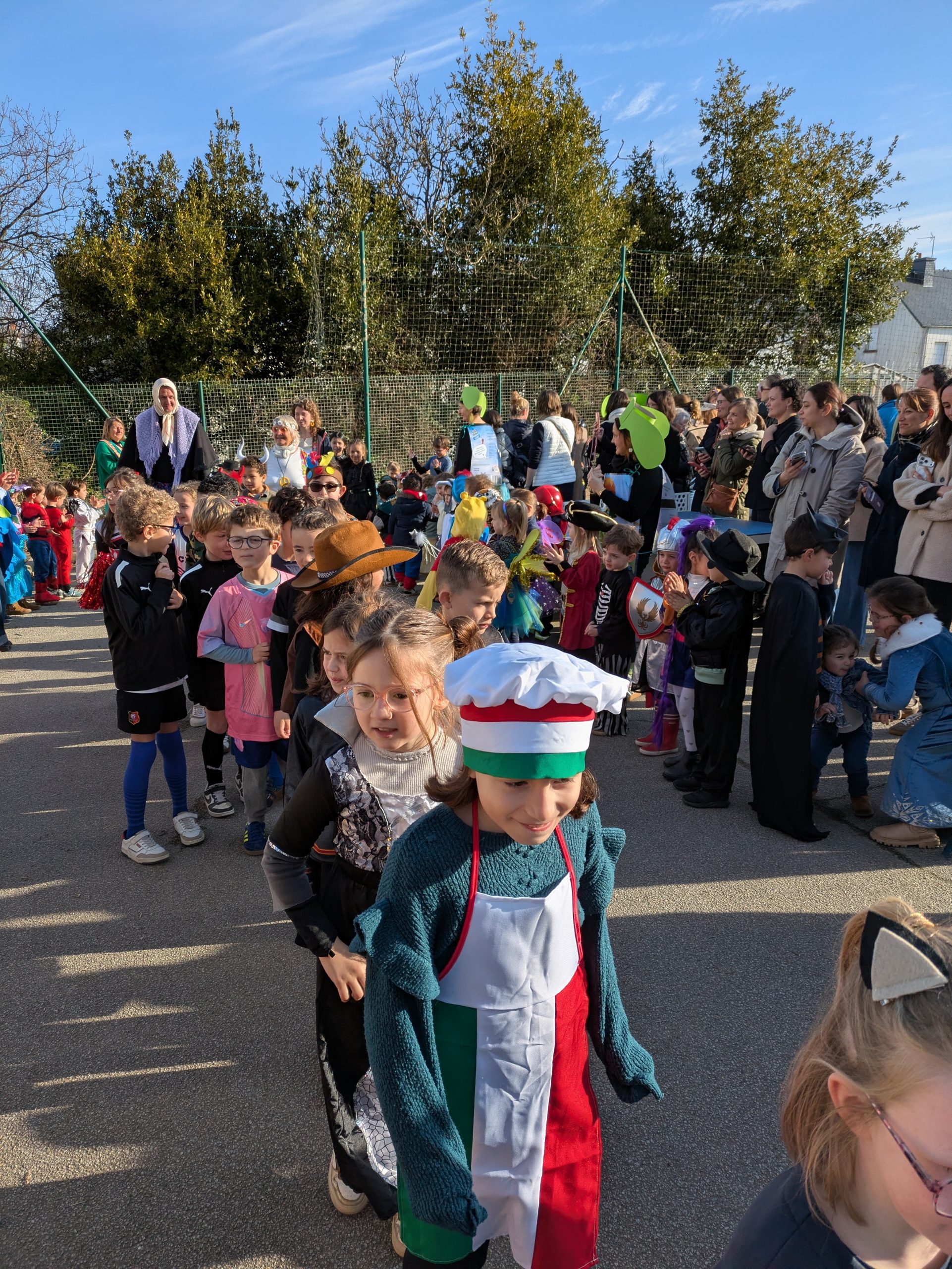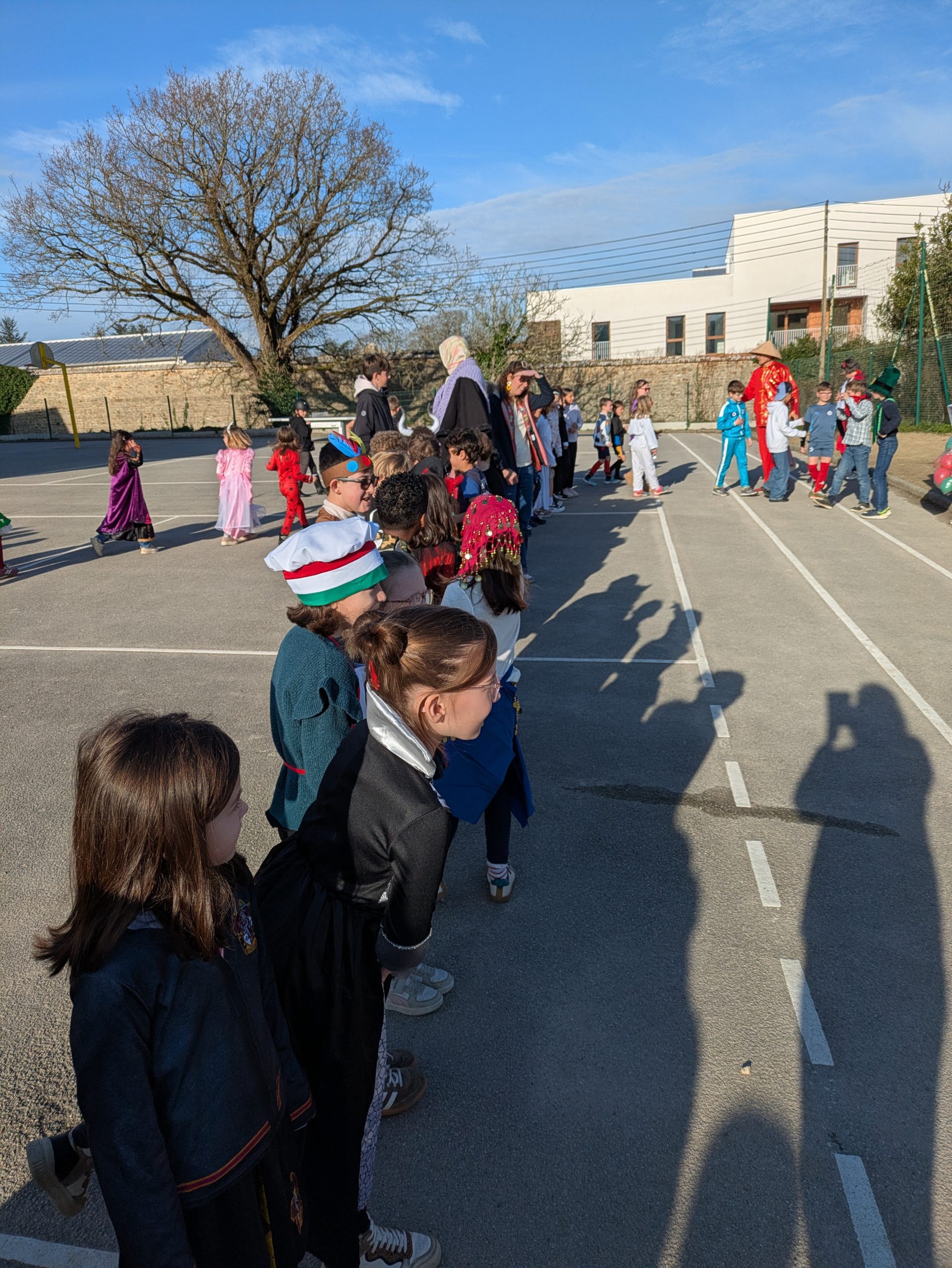 Au cours de la matinée, nous avons défilé, classe après classe, sur la cour  des primaires, sous les applaudissements des adultes, des enfants de l’école et des parents.