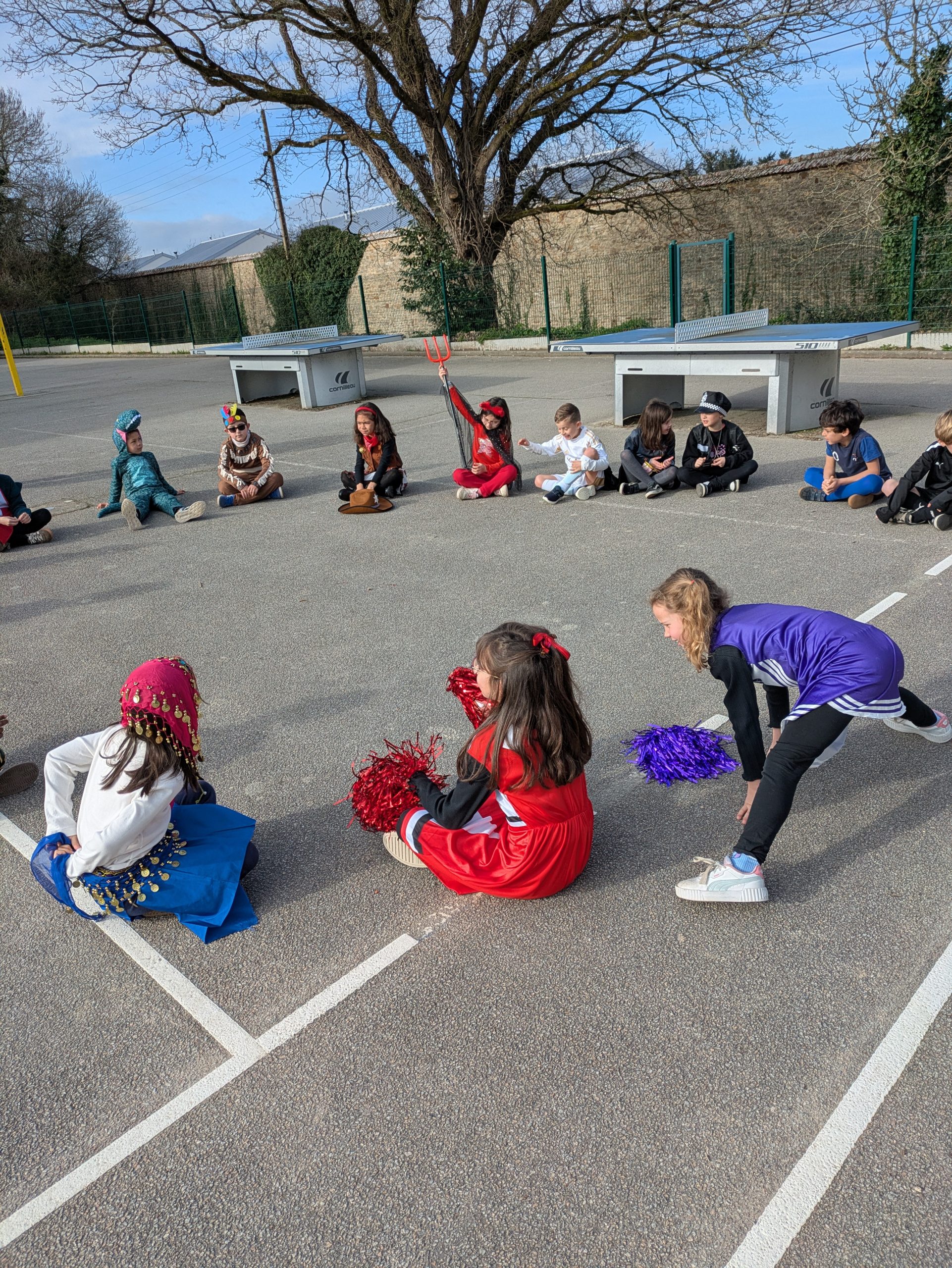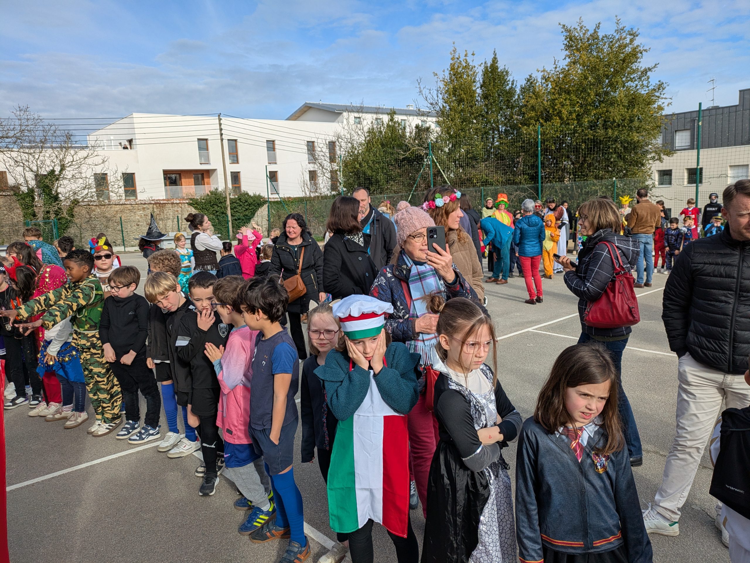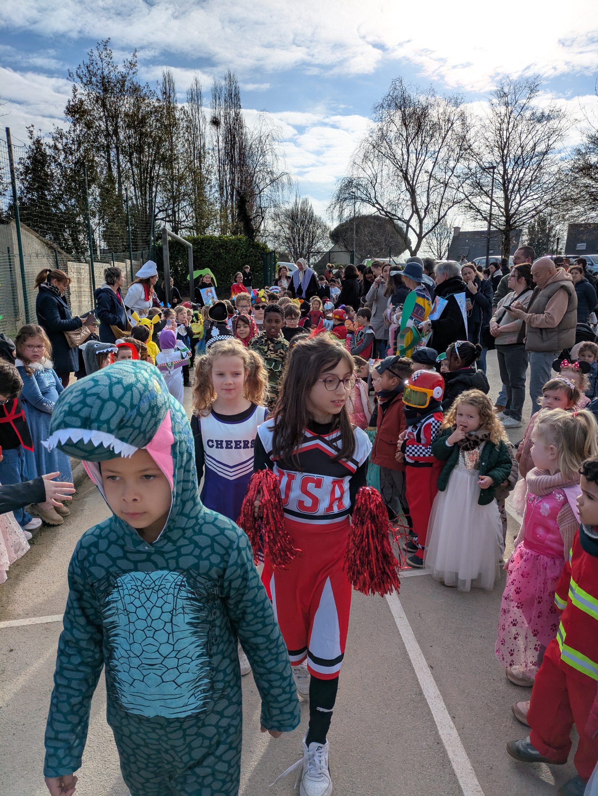Au cours de la matinée, nous avons défilé, classe après classe, sur la cour  des primaires, sous les applaudissements des adultes, des enfants de l’école et des parents.