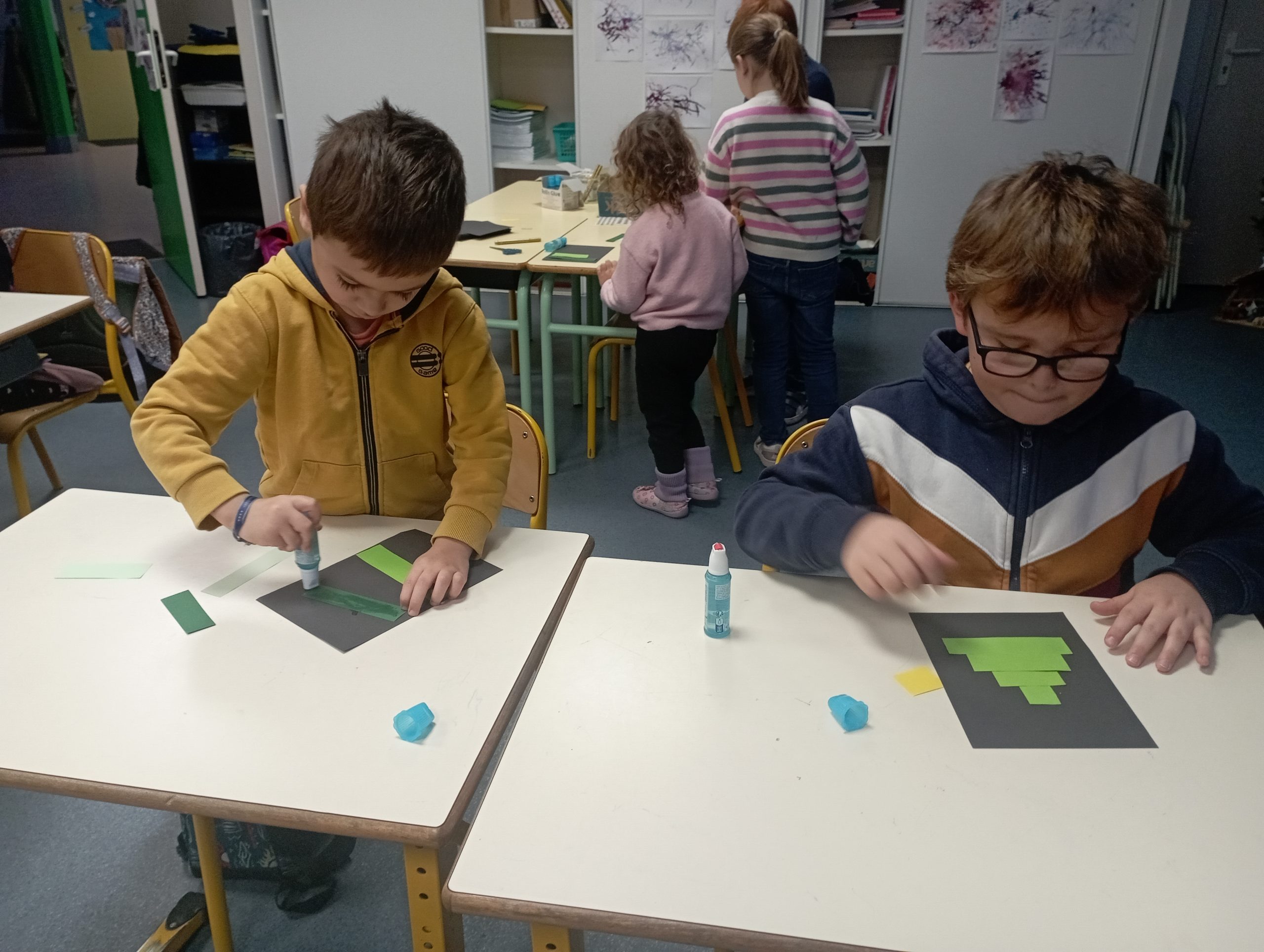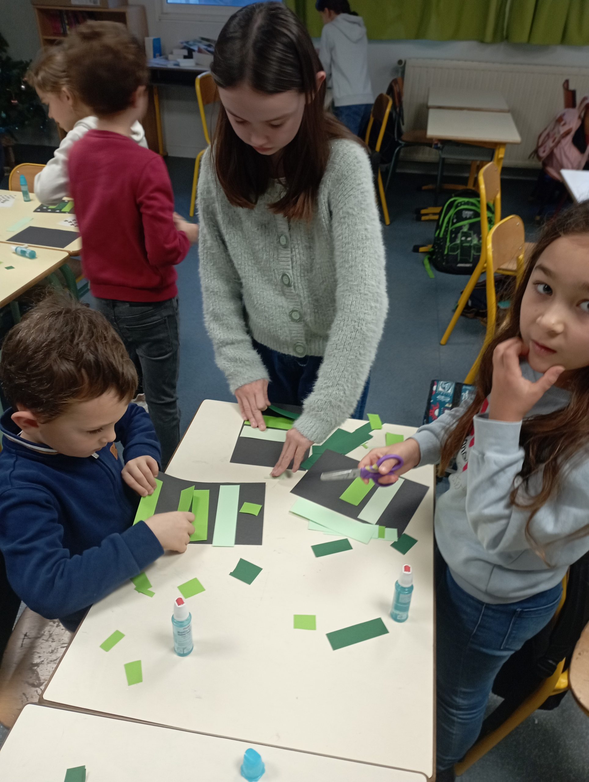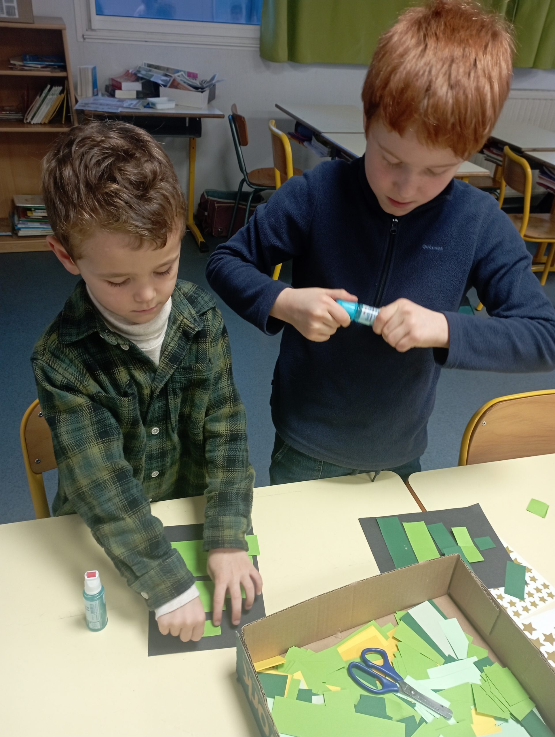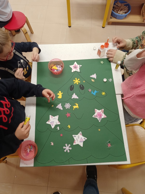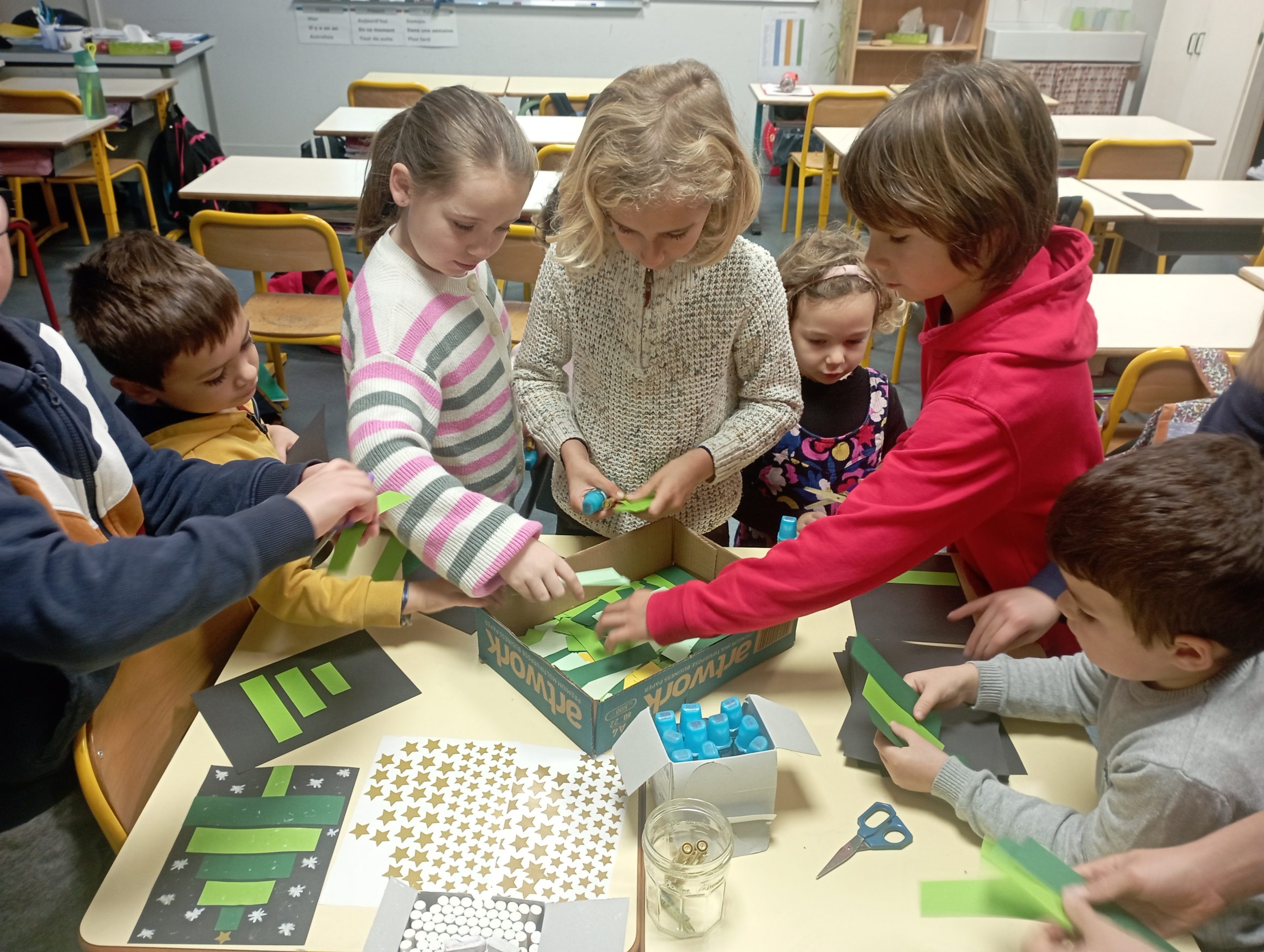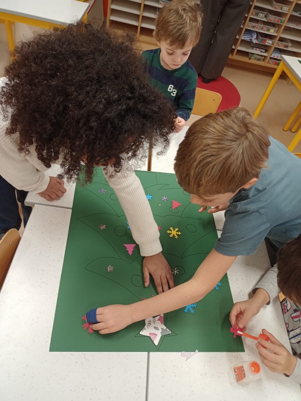 Atelier arts visuels (collectif) dont l’objectif est de décorer des sapins XXL en collant des décorations.