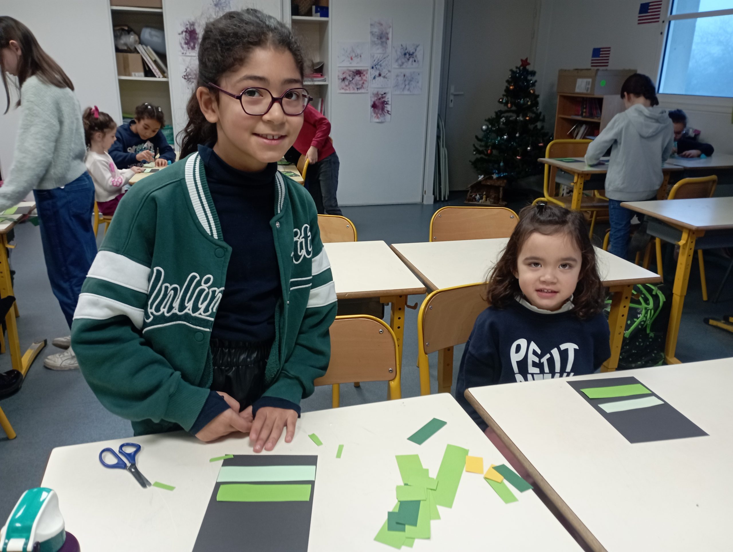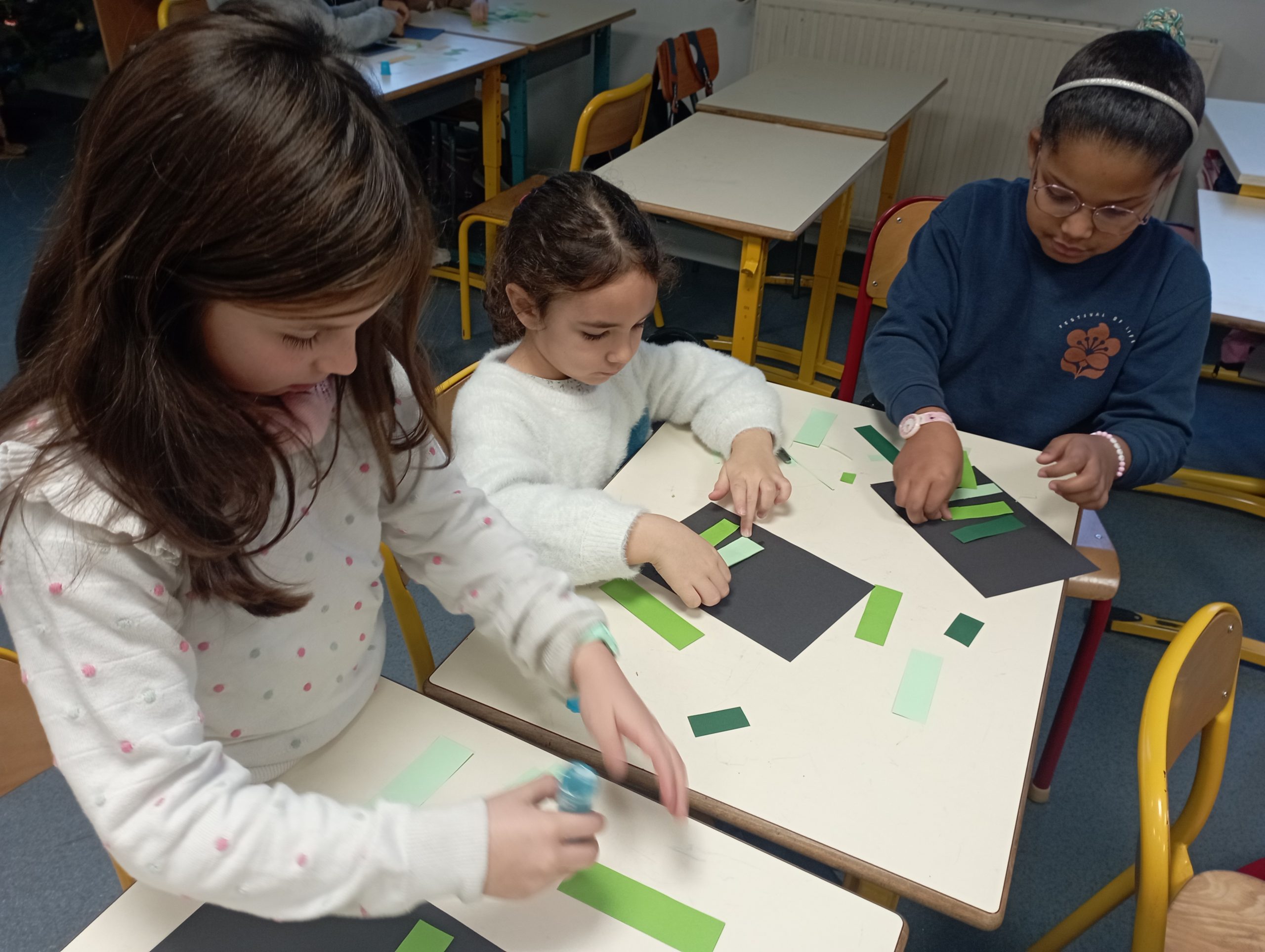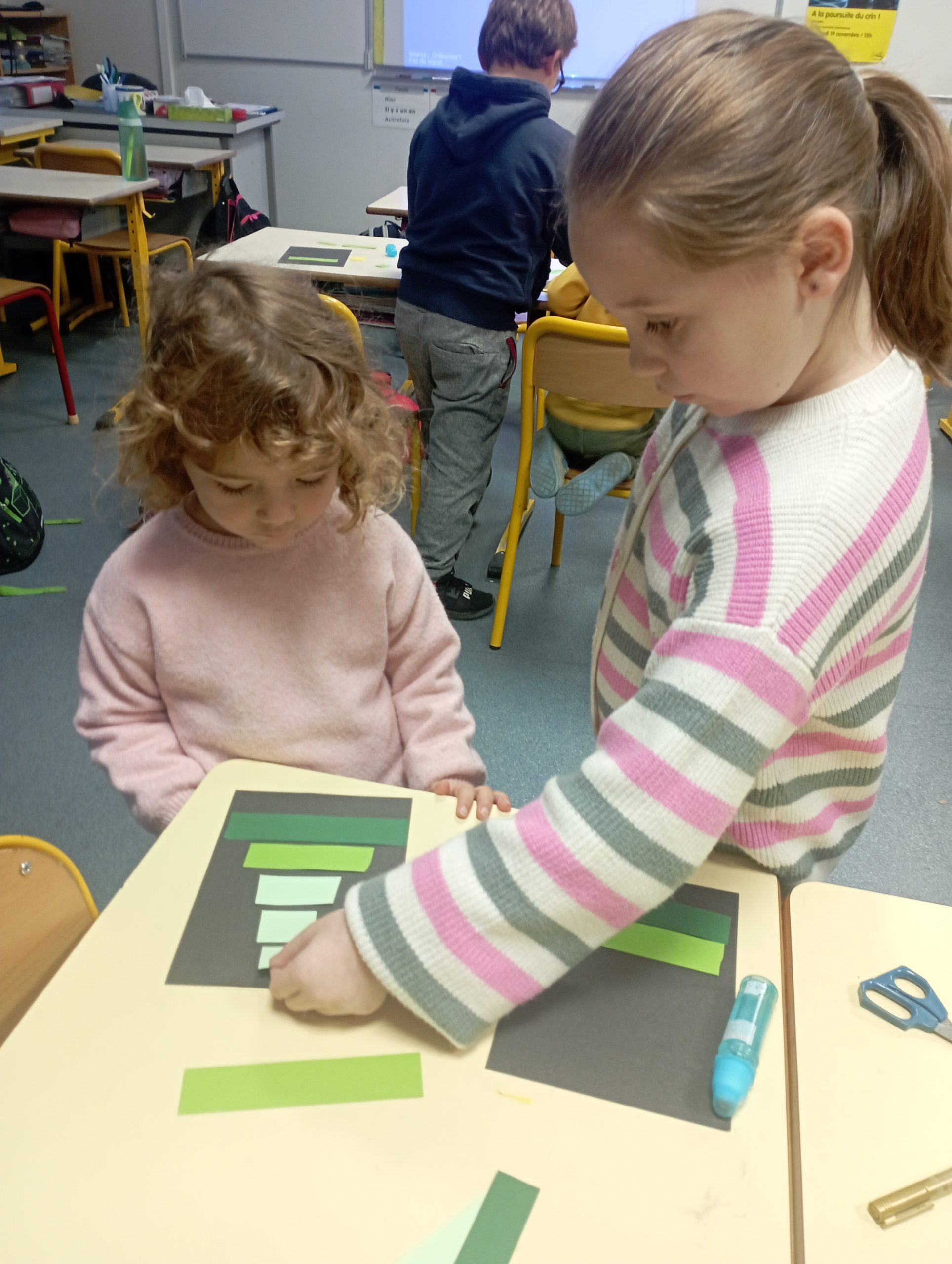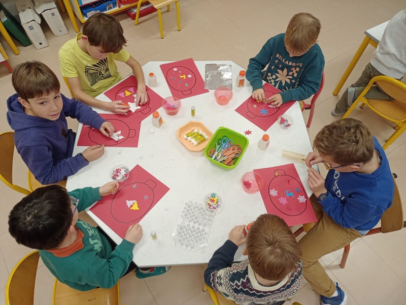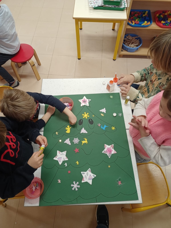 Atelier arts visuels (collectif) dont l’objectif est de décorer des sapins XXL en collant des décorations.