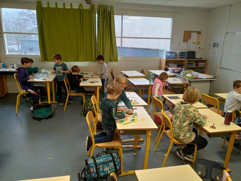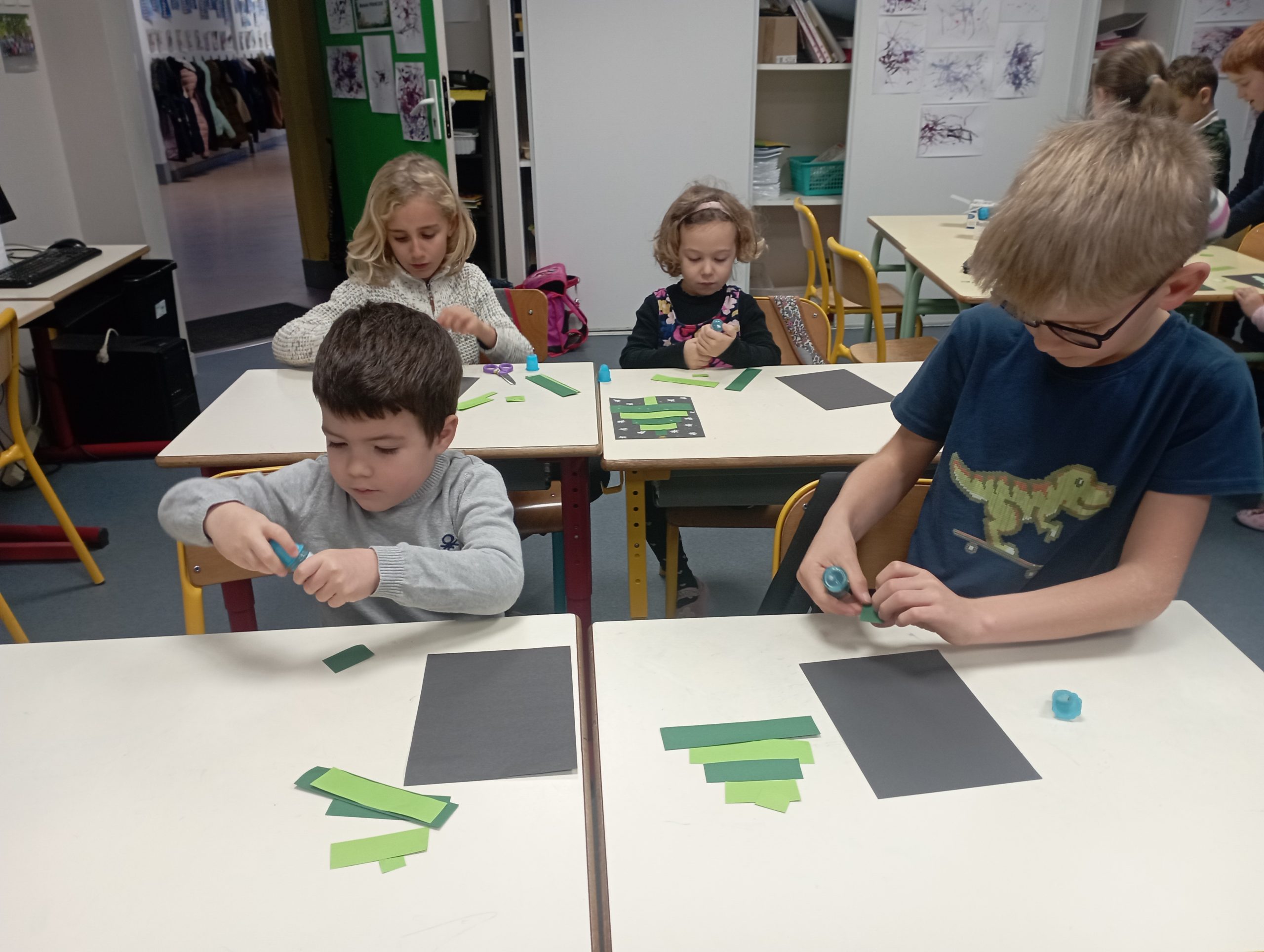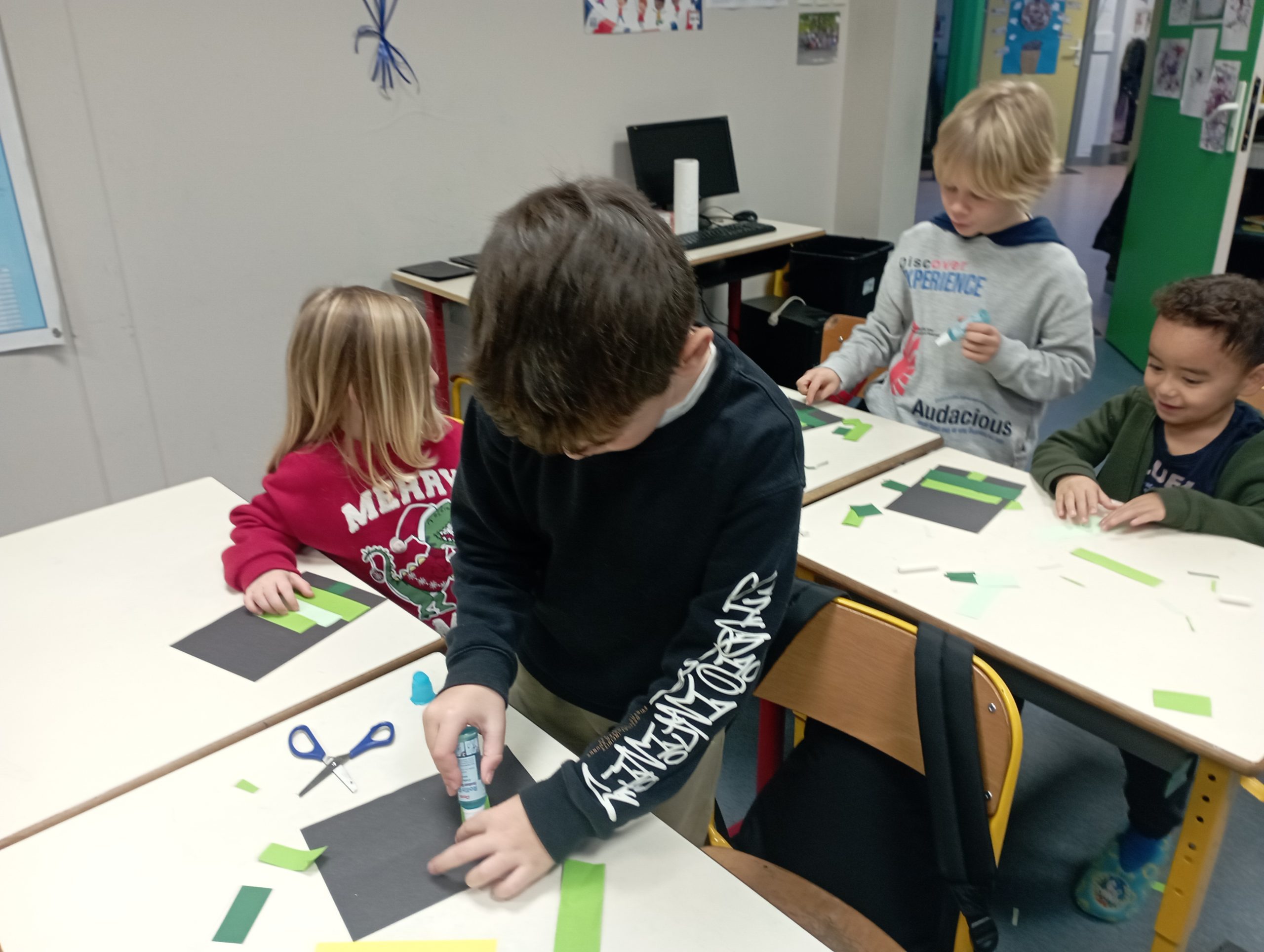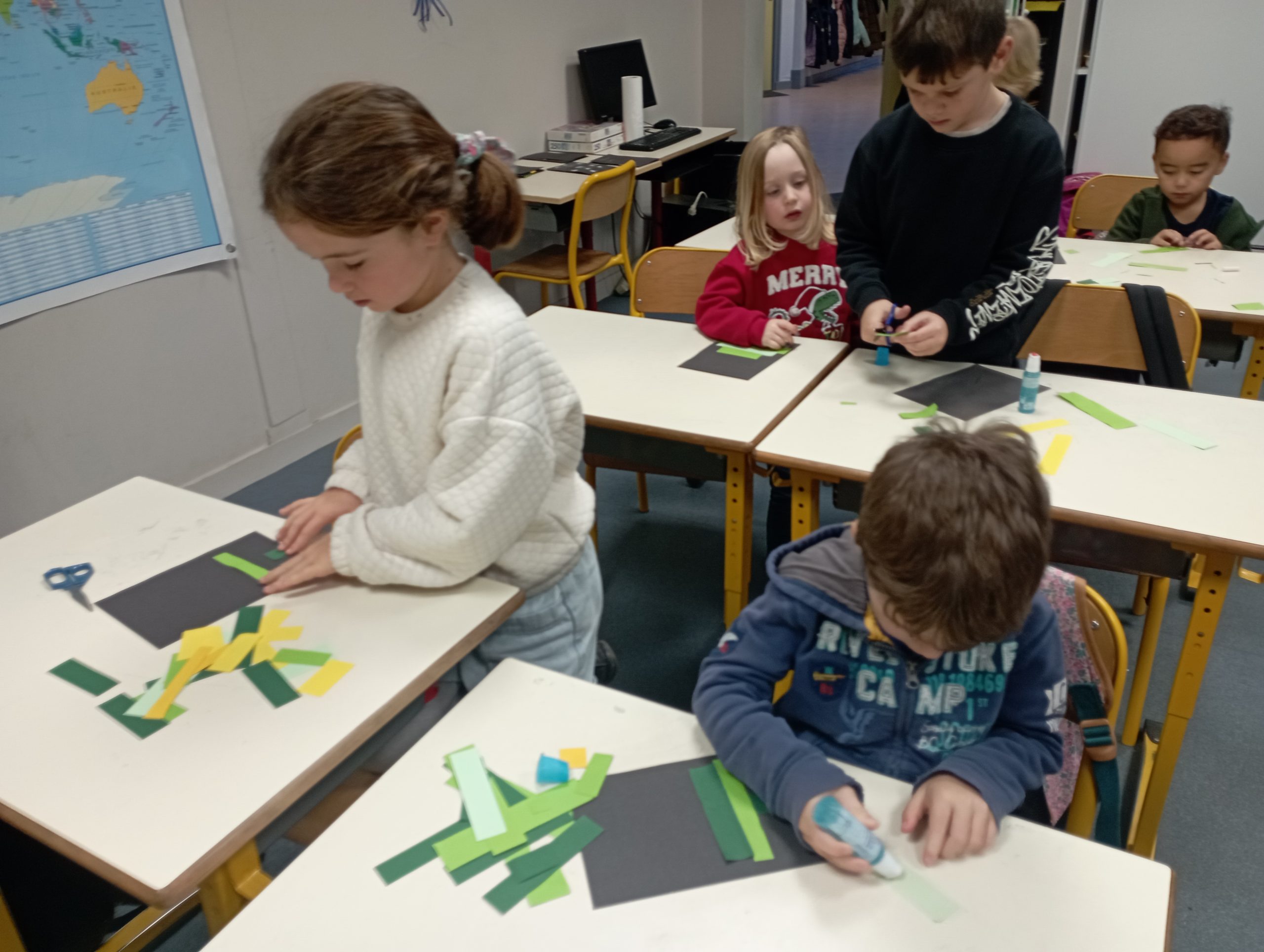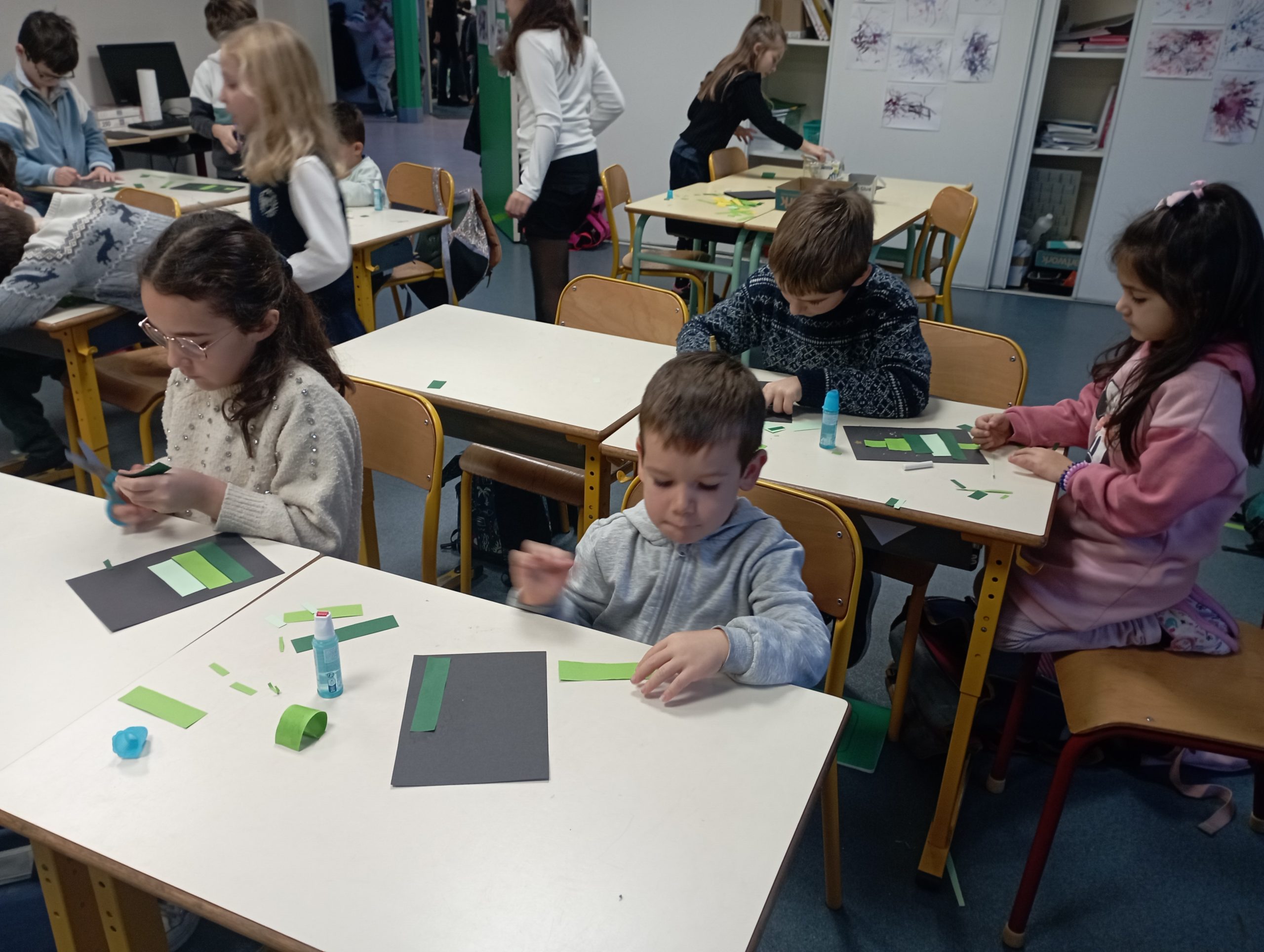 Atelier arts visuels (collectif) dont l’objectif est de décorer des sapins XXL en collant des décorations.