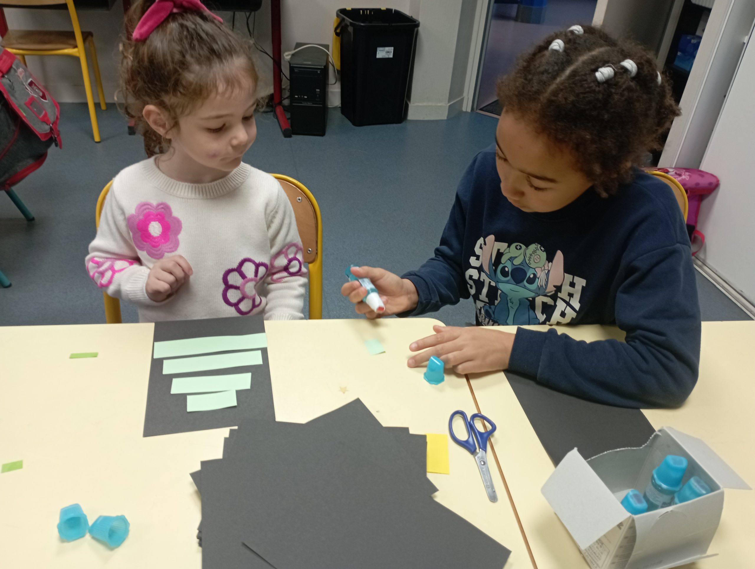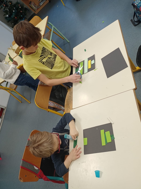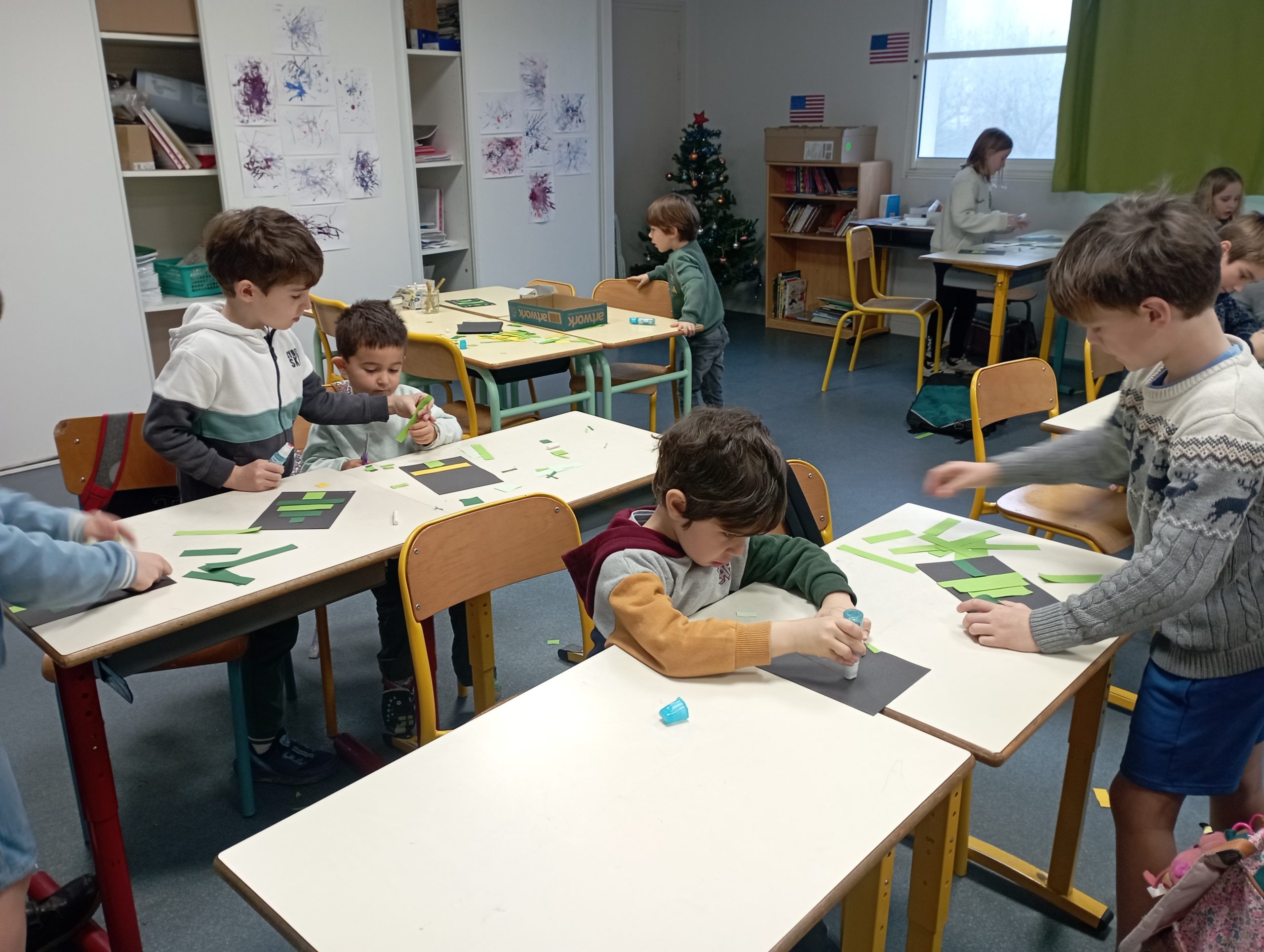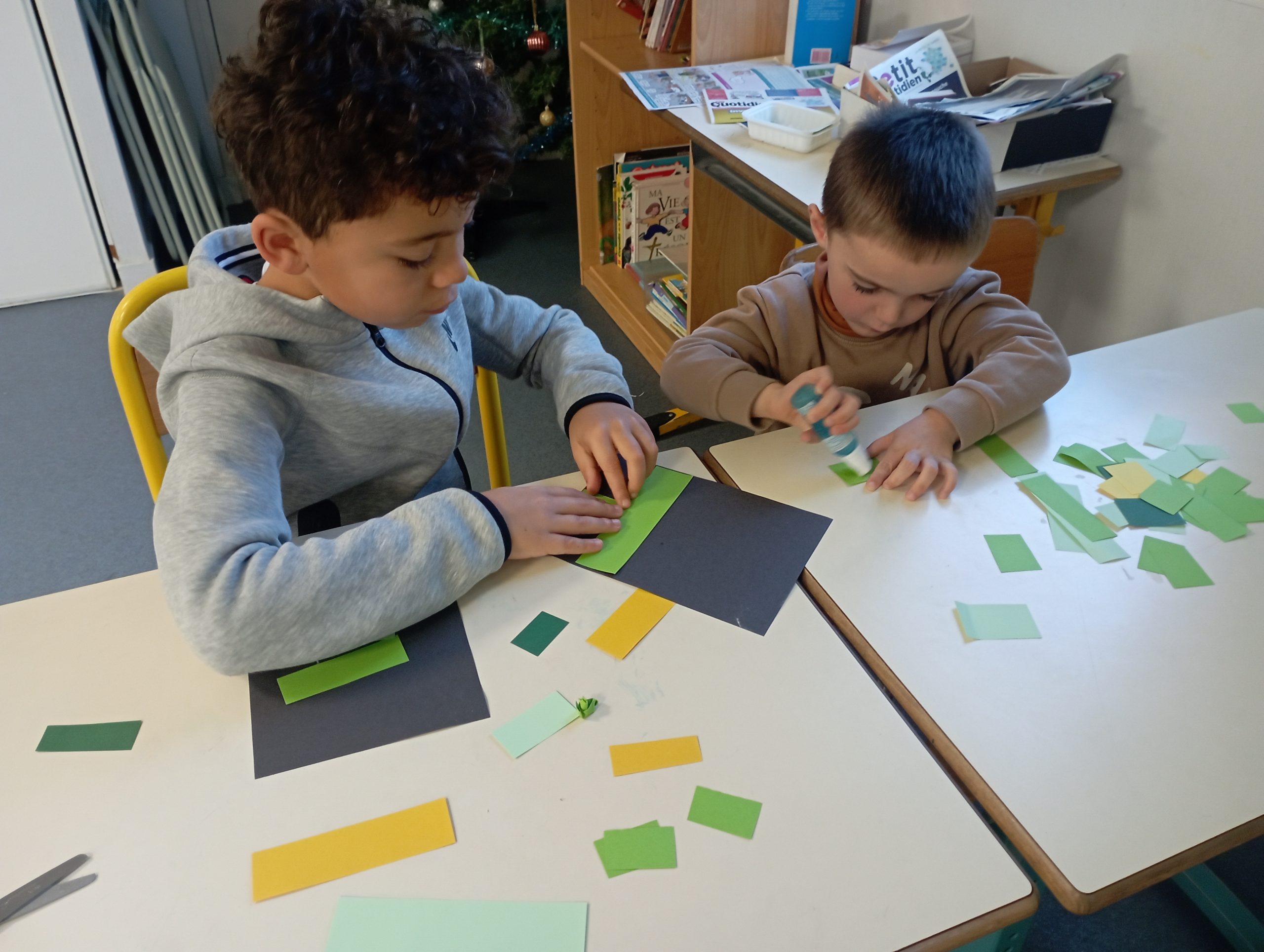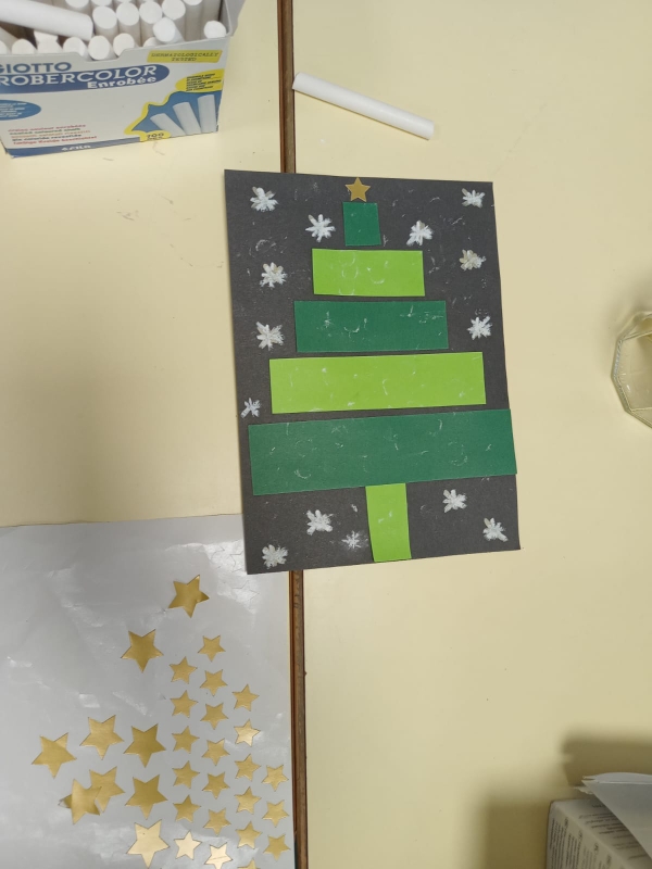 Atelier arts visuels (individuel) dont l’objectif est de créer une carte de Noël par la technique du collage.