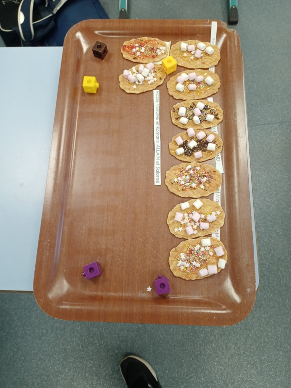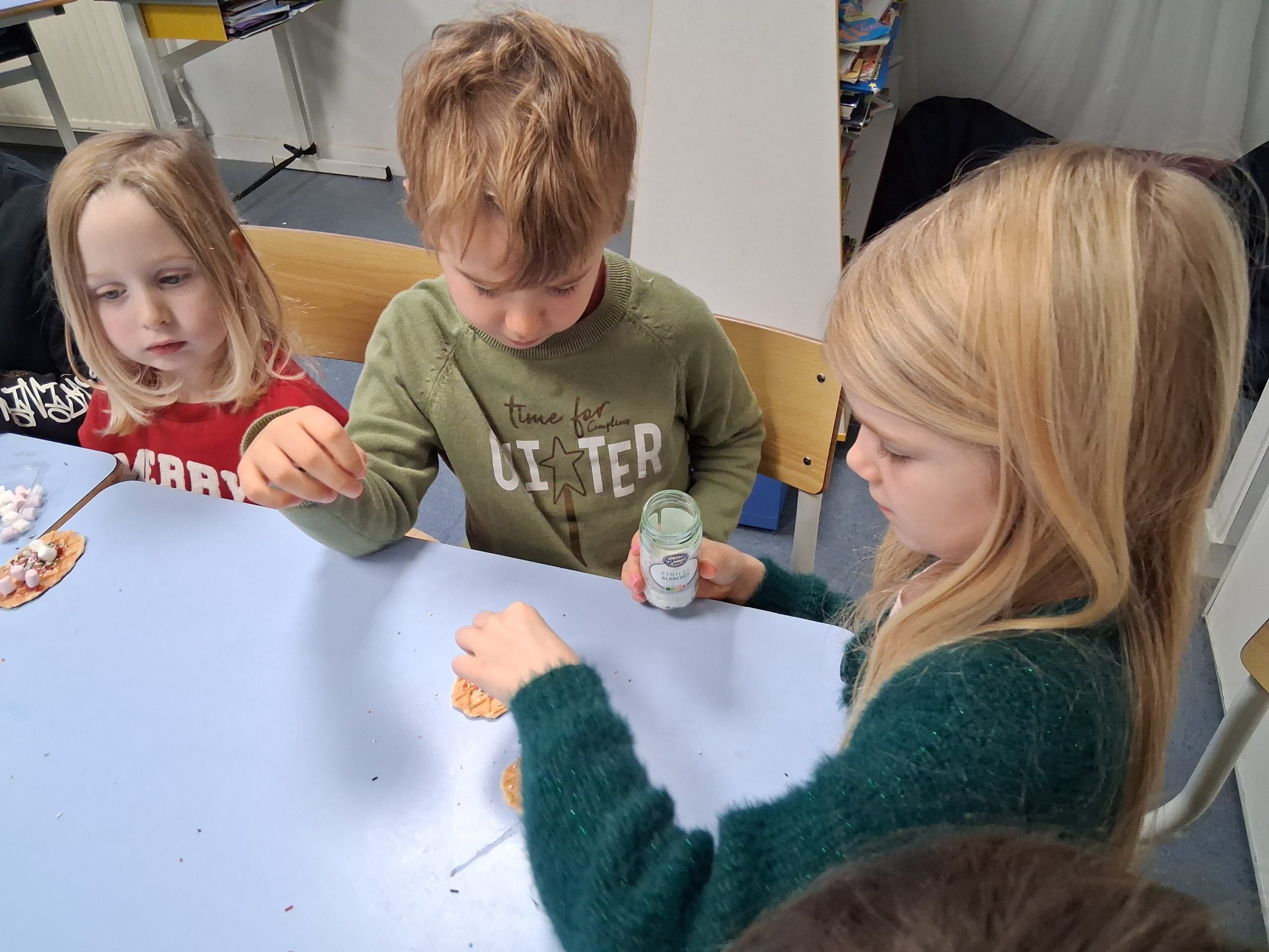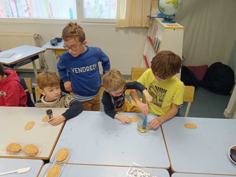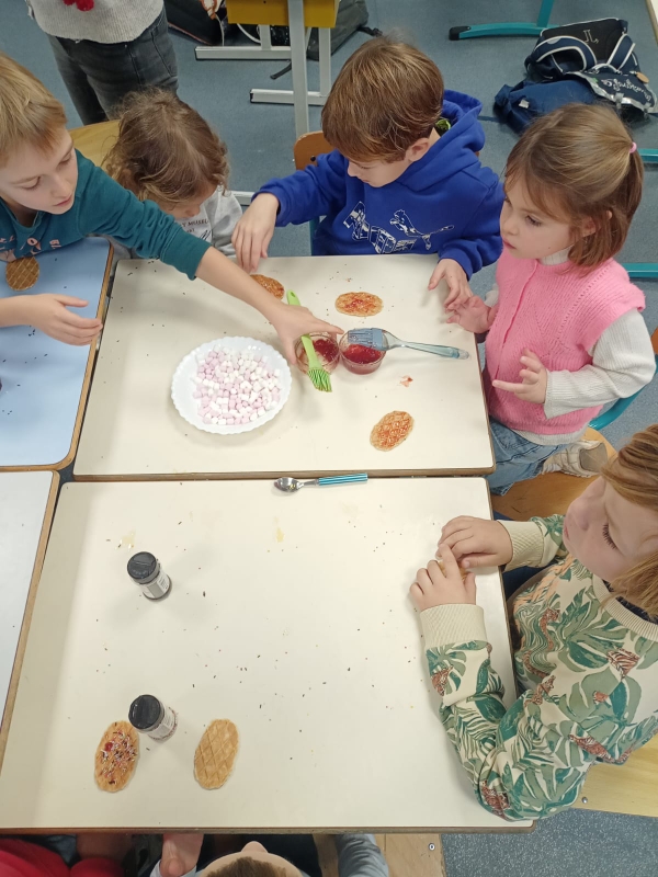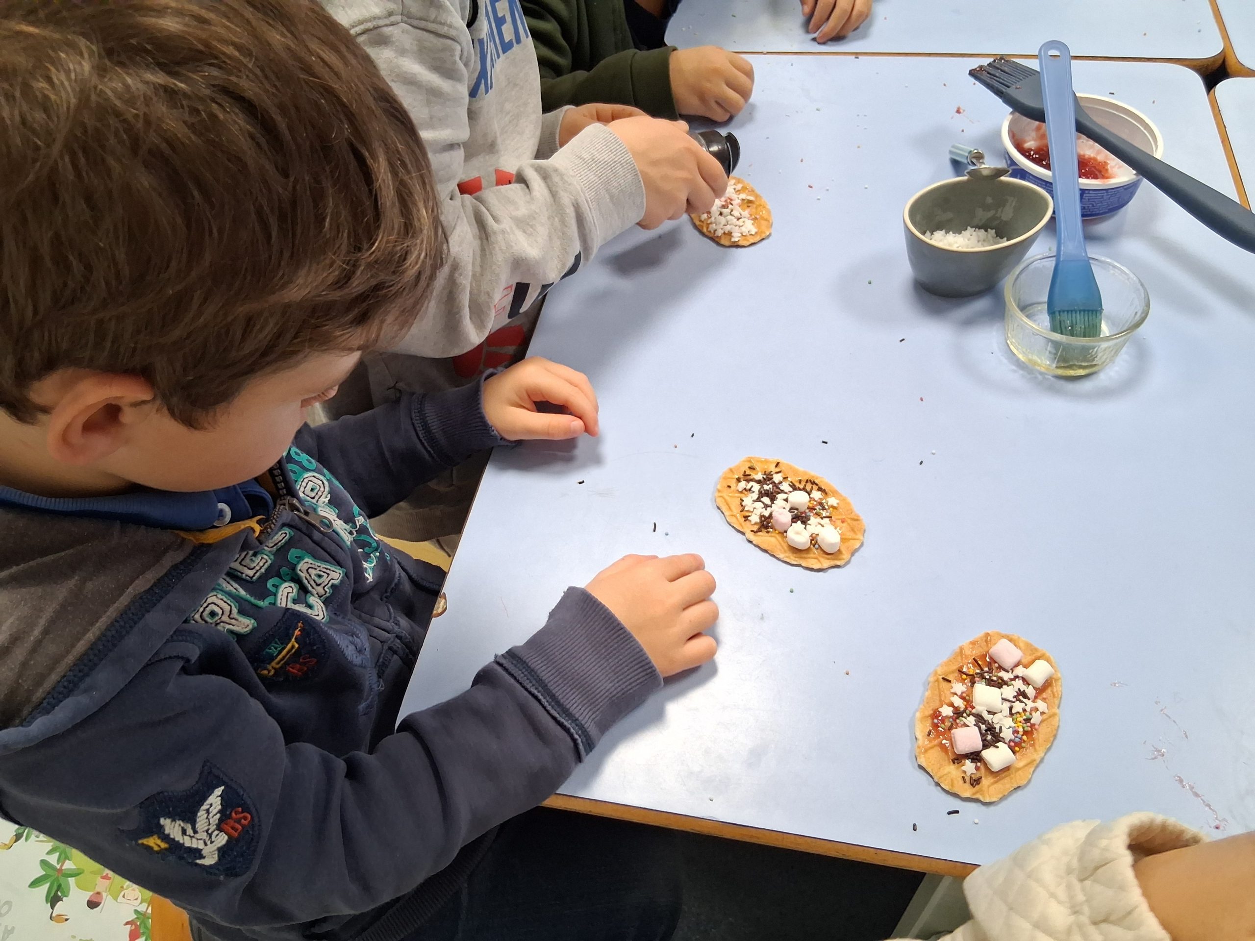 Atelier cuisine dont l’objectif est de préparer une boule de Noël en cumulant miel ou confiture, mini-guimauves, vermicelle au chocolat…