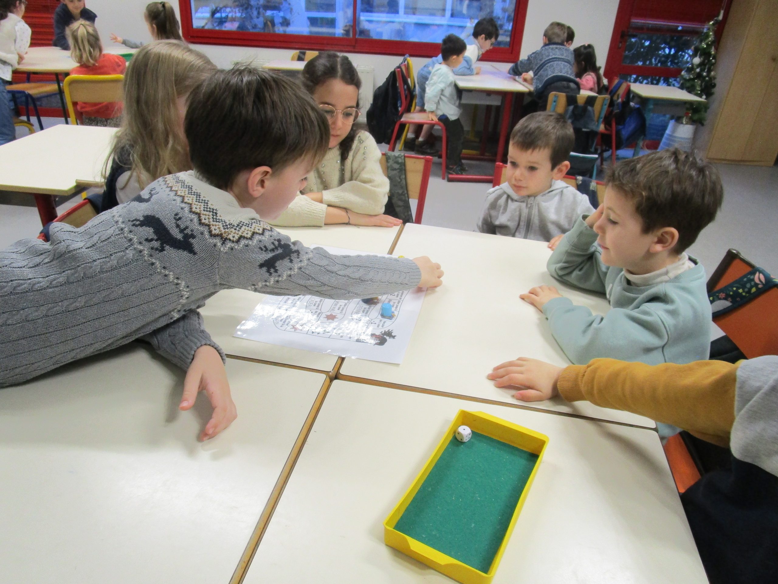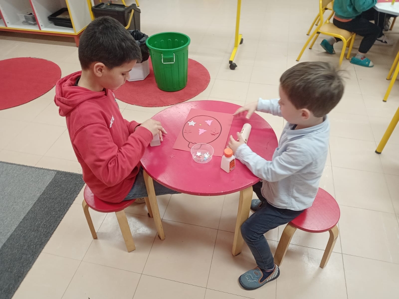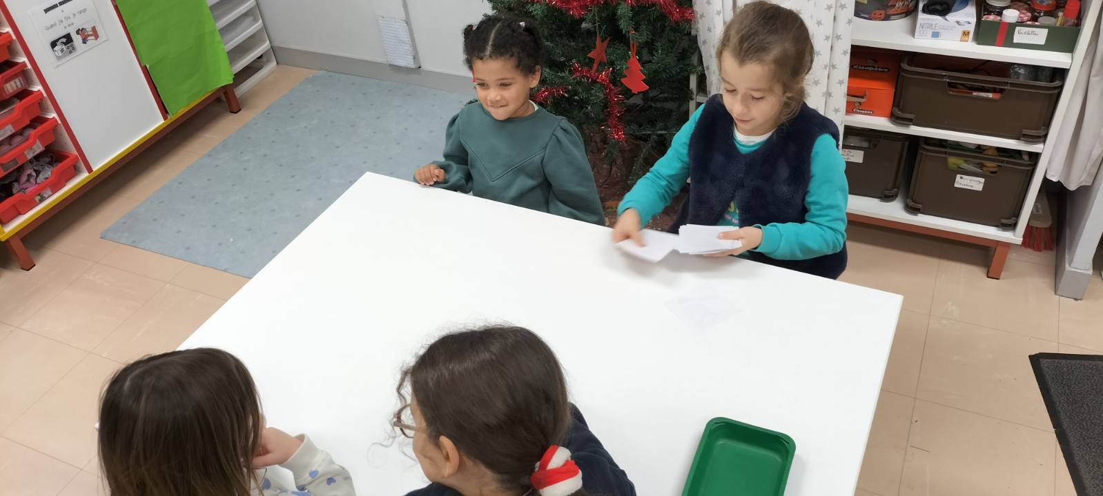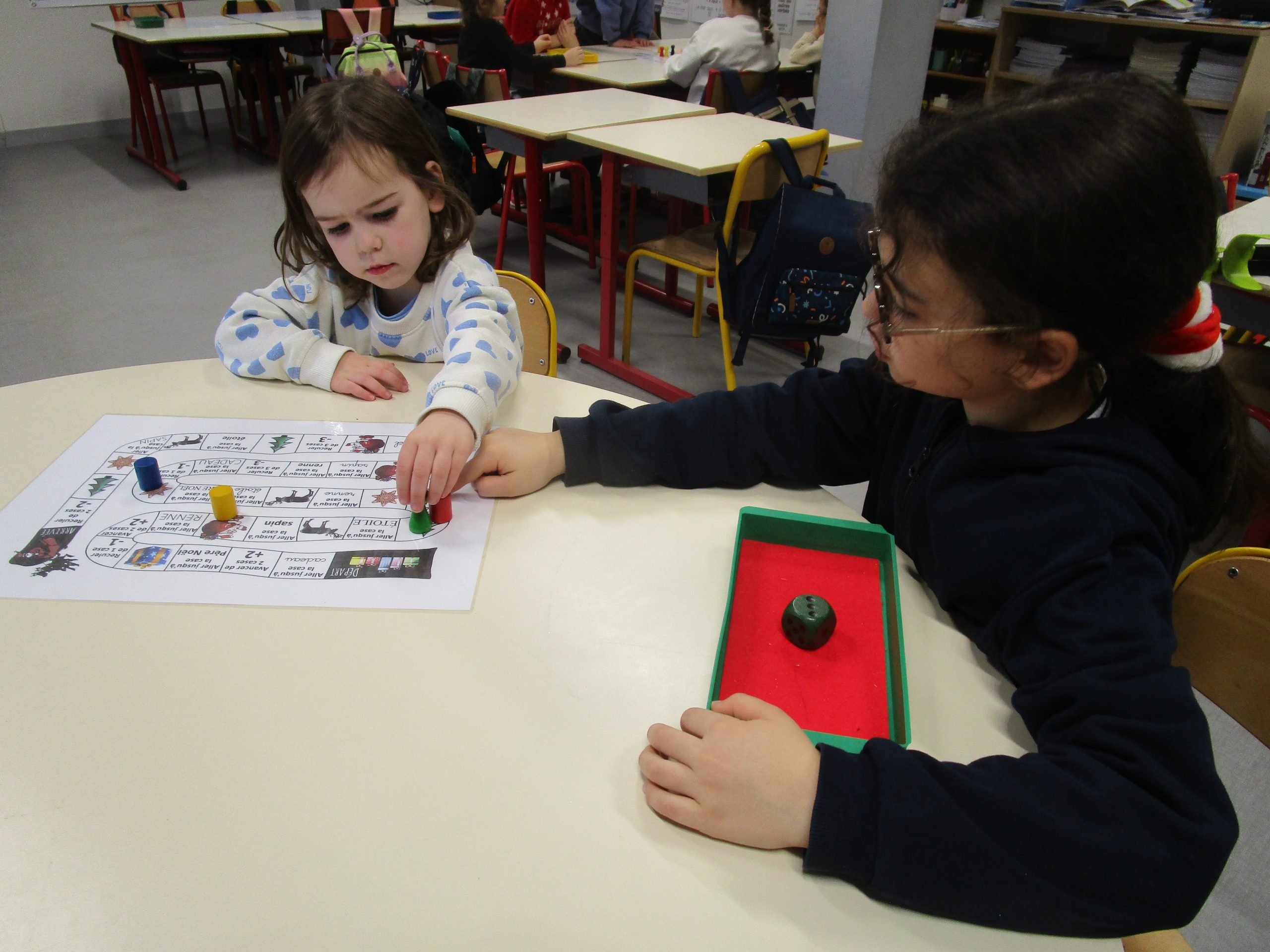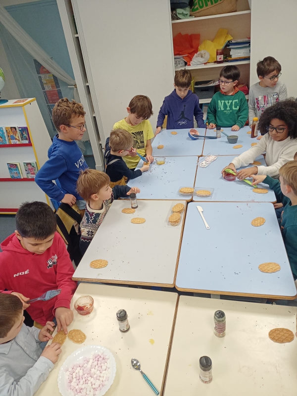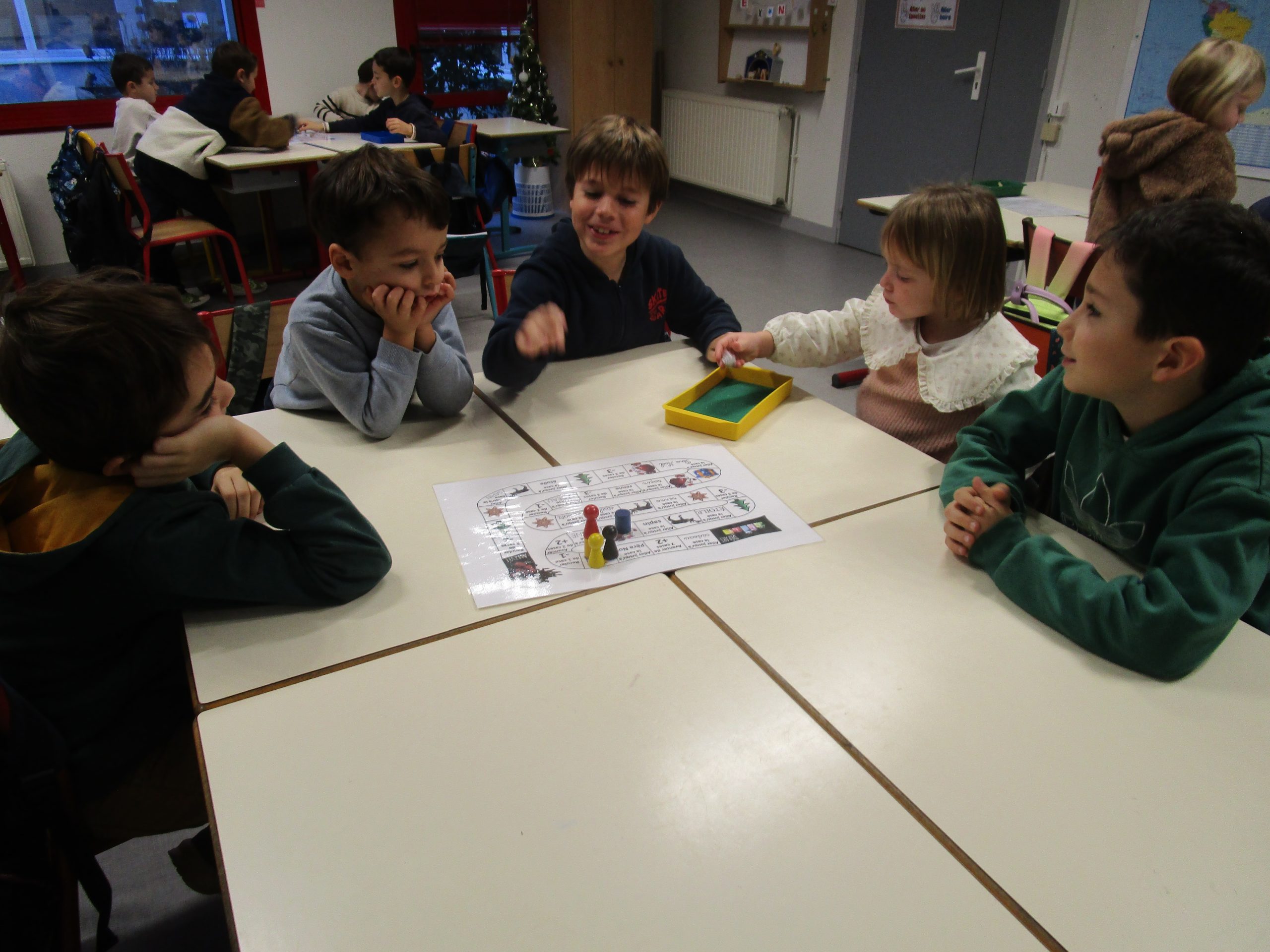 Nous retrouvons nos parrains et marraines de CE 2 non pas pour notre lecture hebdomadaire mais pour participer à une matinée commune sur le thème de Noël. Sept ateliers sont au programme. C’est en petits groupes, toujours sous la conduite d’un adulte, que nous déambulons dans leurs différents espaces.