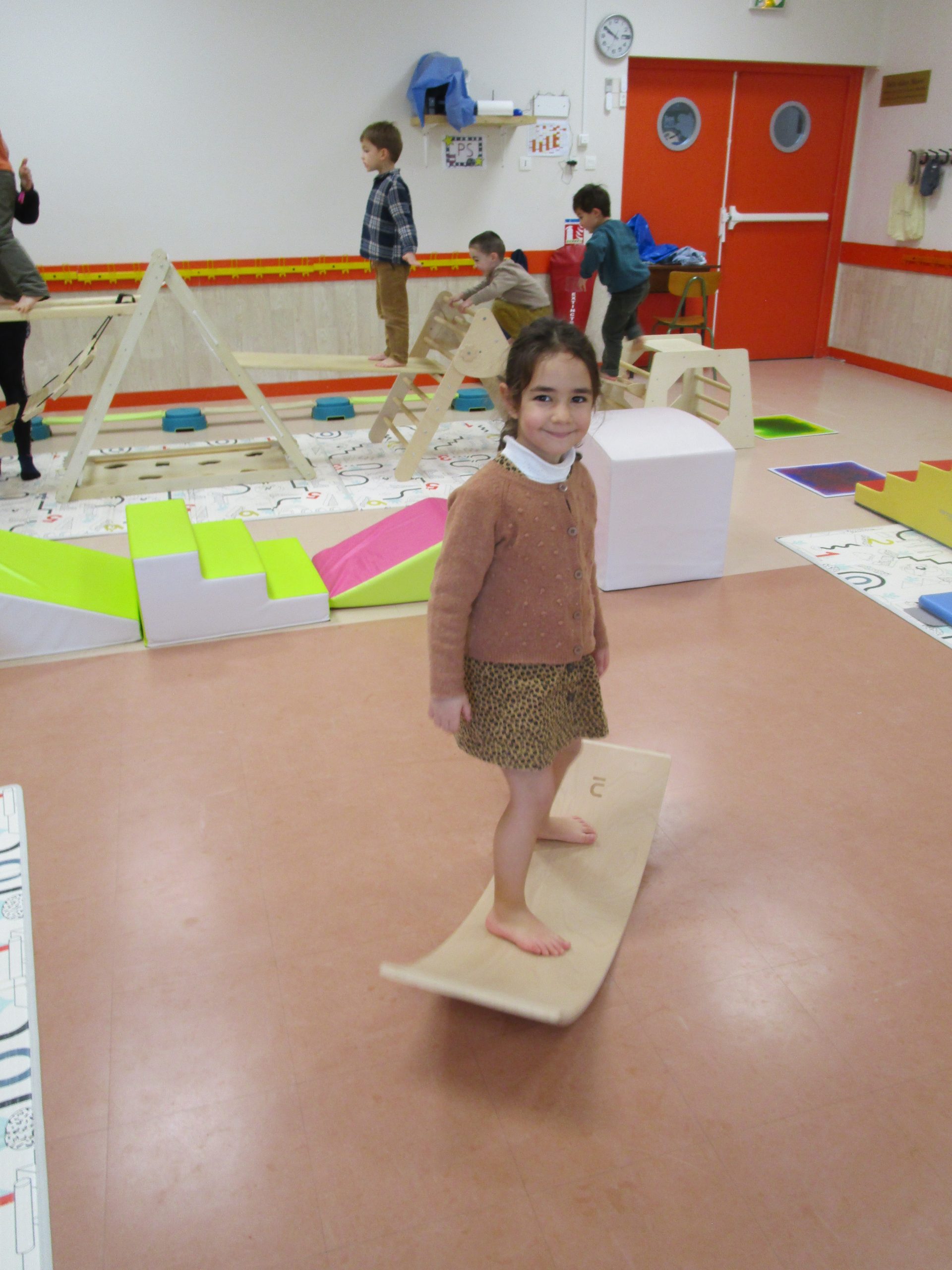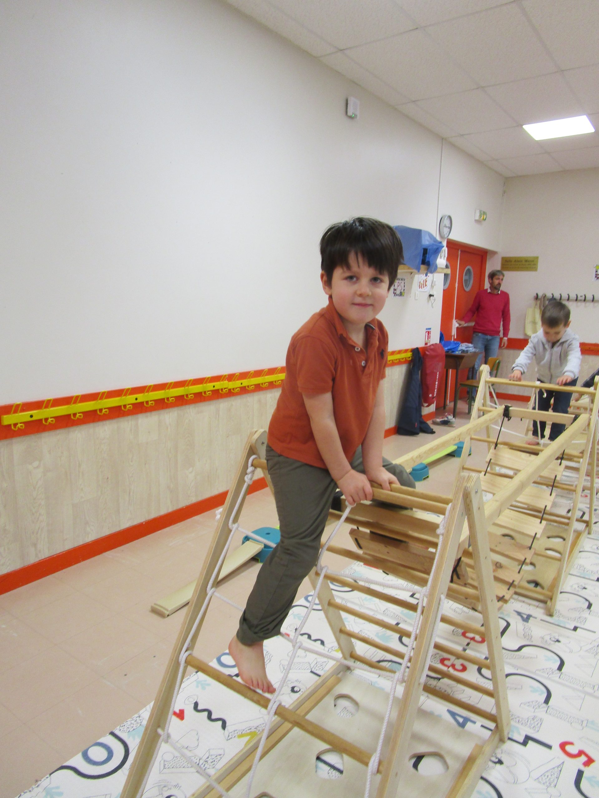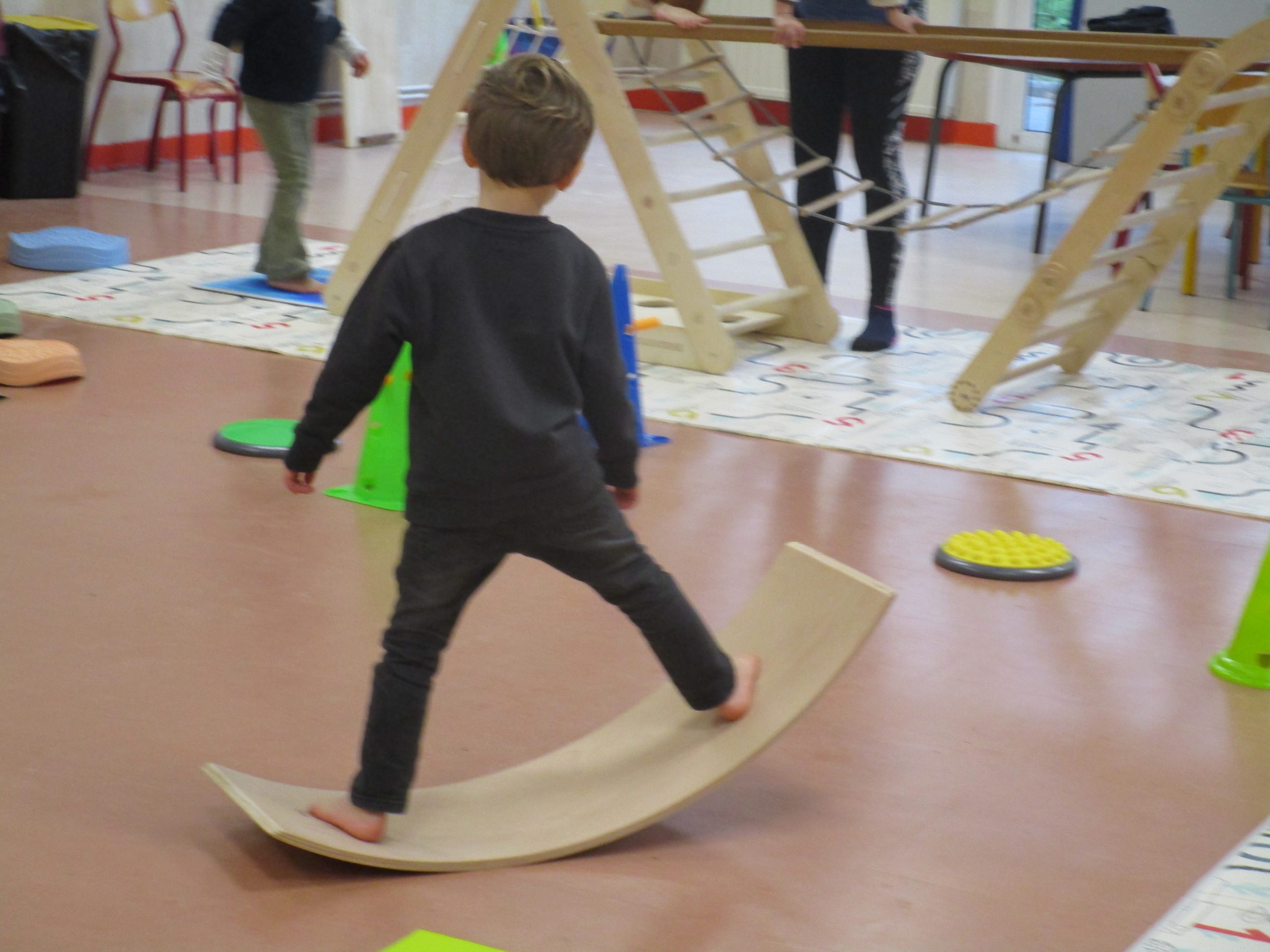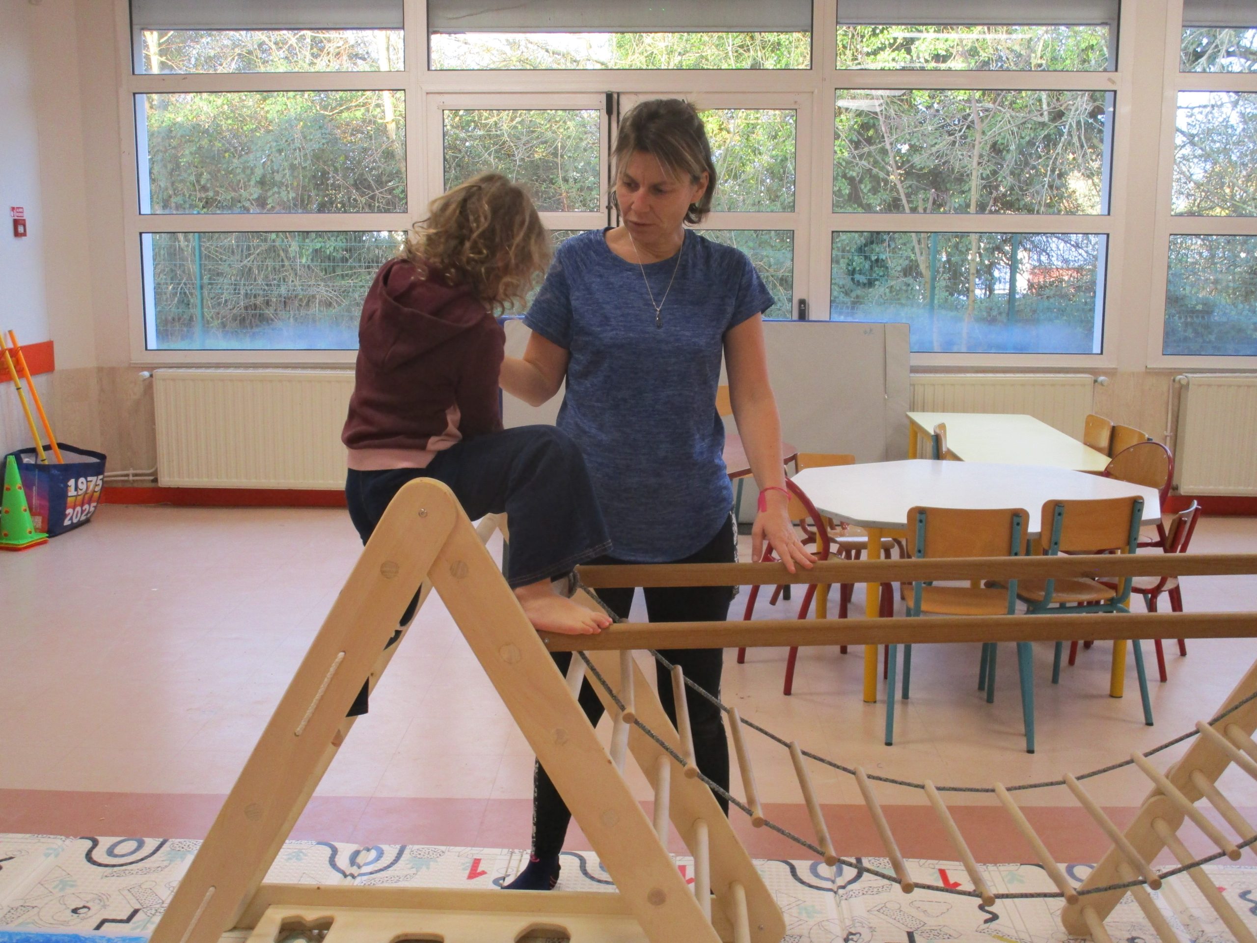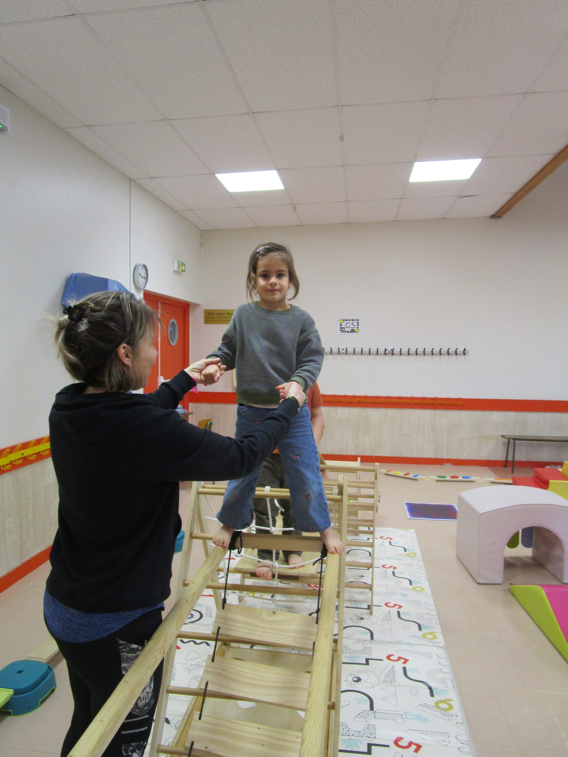 Nous avons la chance d’accueillir VALERIE, la maman d’ALIX, avec son parcours de motricité XXL. Quel plaisir de déambuler, grimper, rouler, escalader… pieds nus dans ces magnifiques structures aux multiples facettes : pont de singe, tunnel, espalier, poutres… Le plaisir des enfants était réel, très visiblement réel !!!