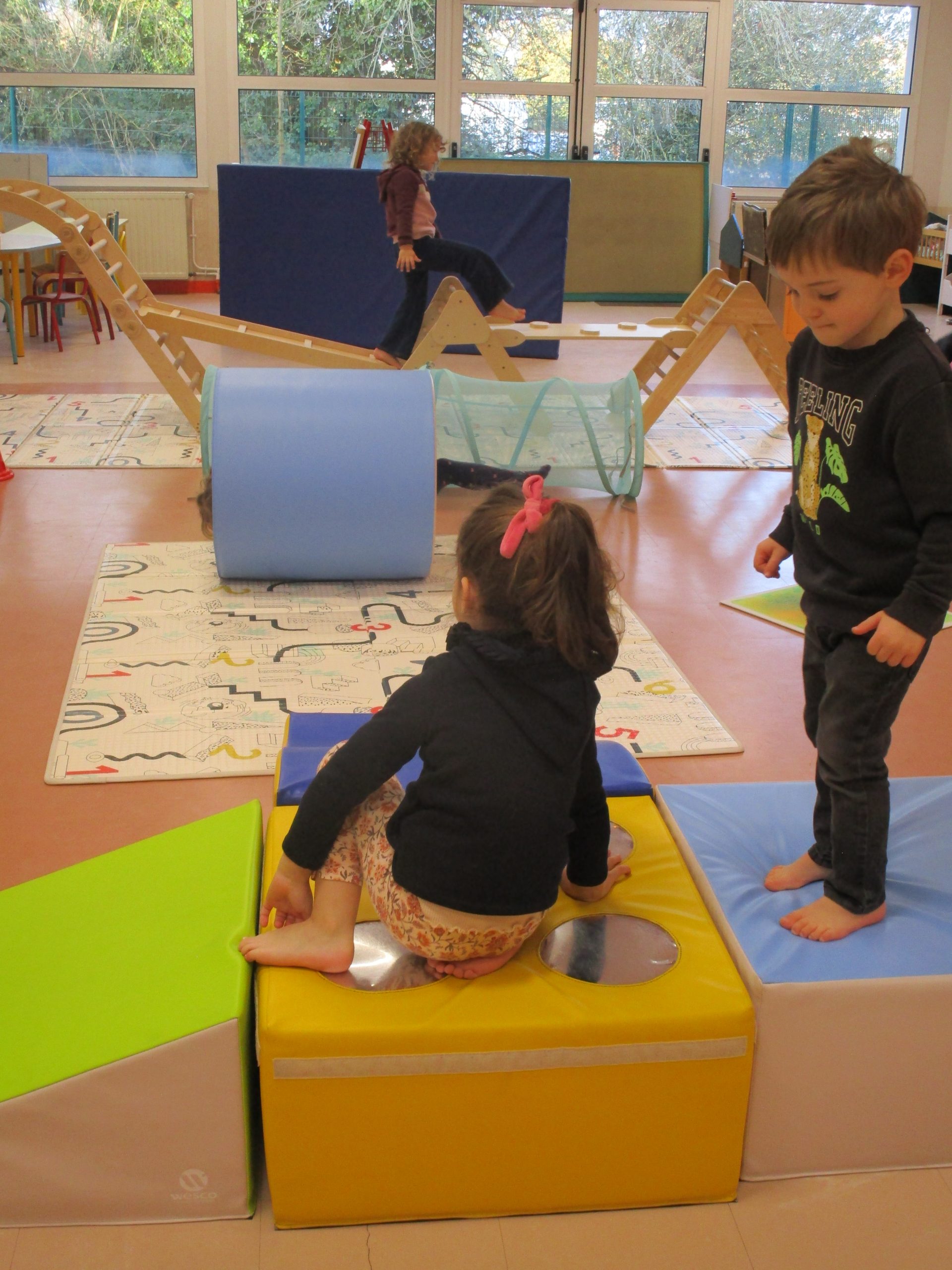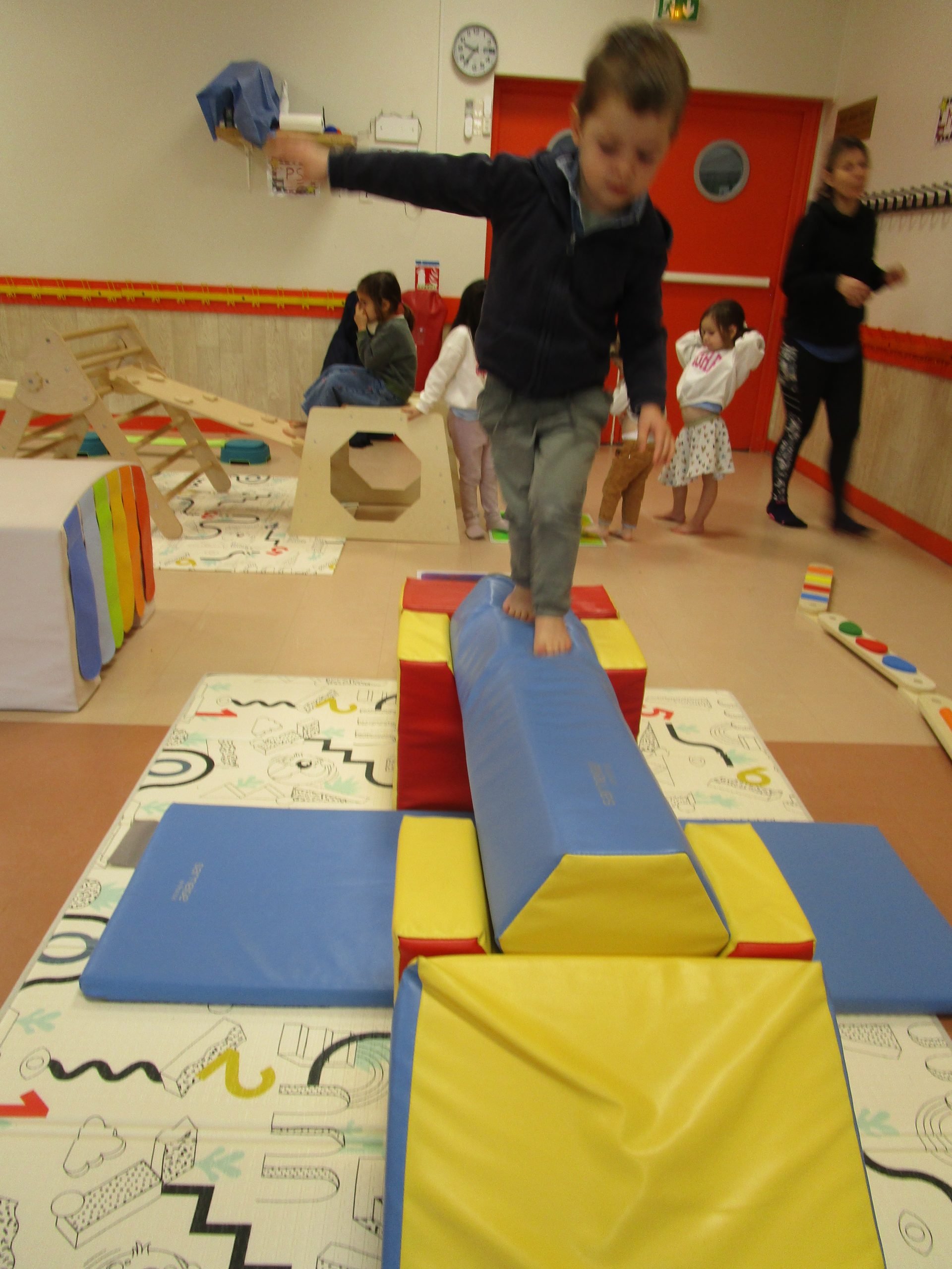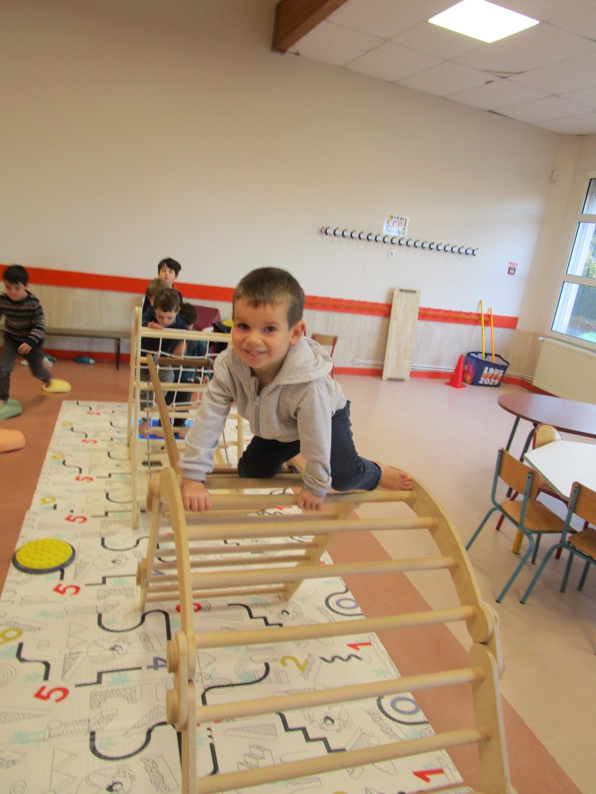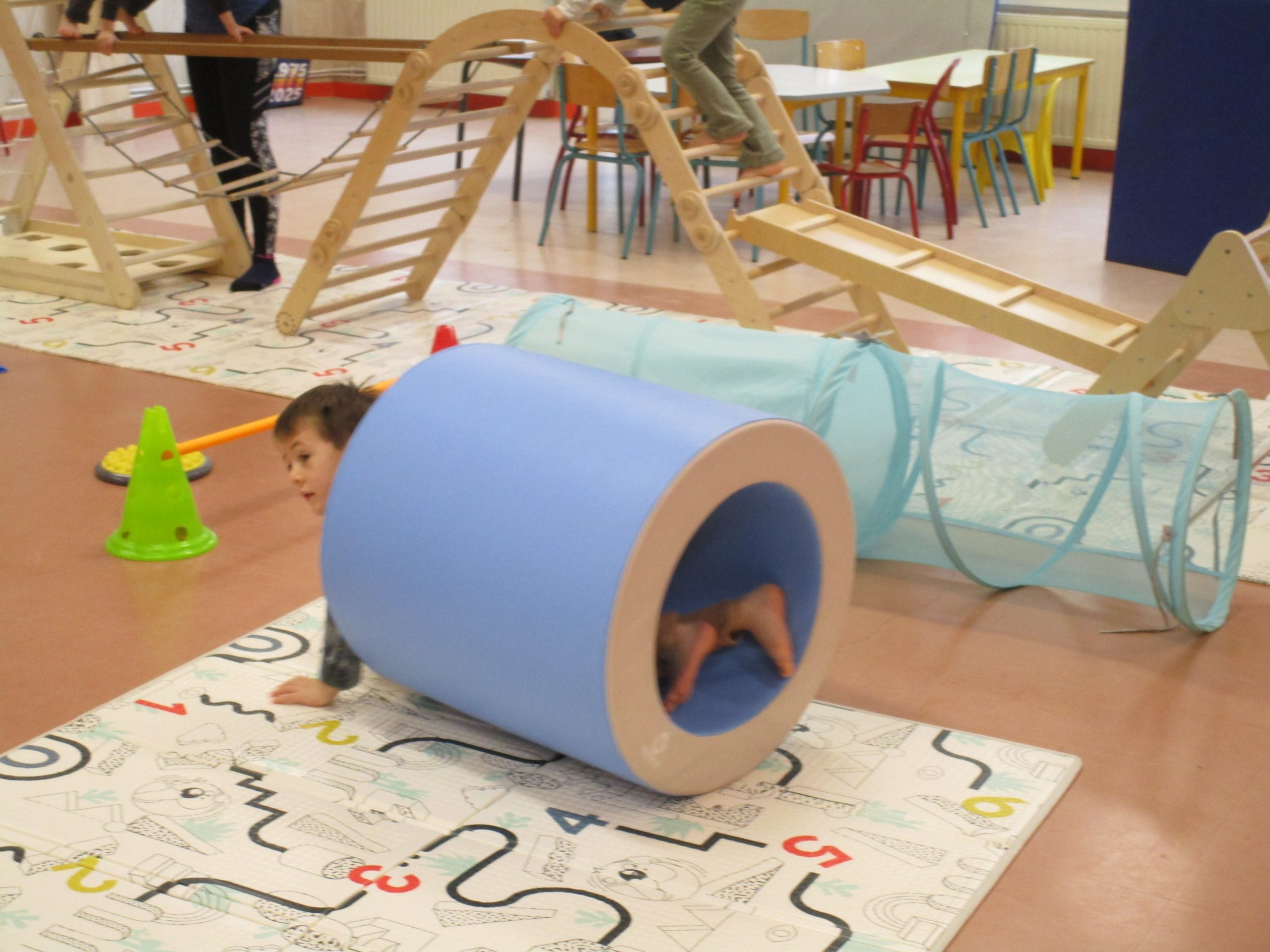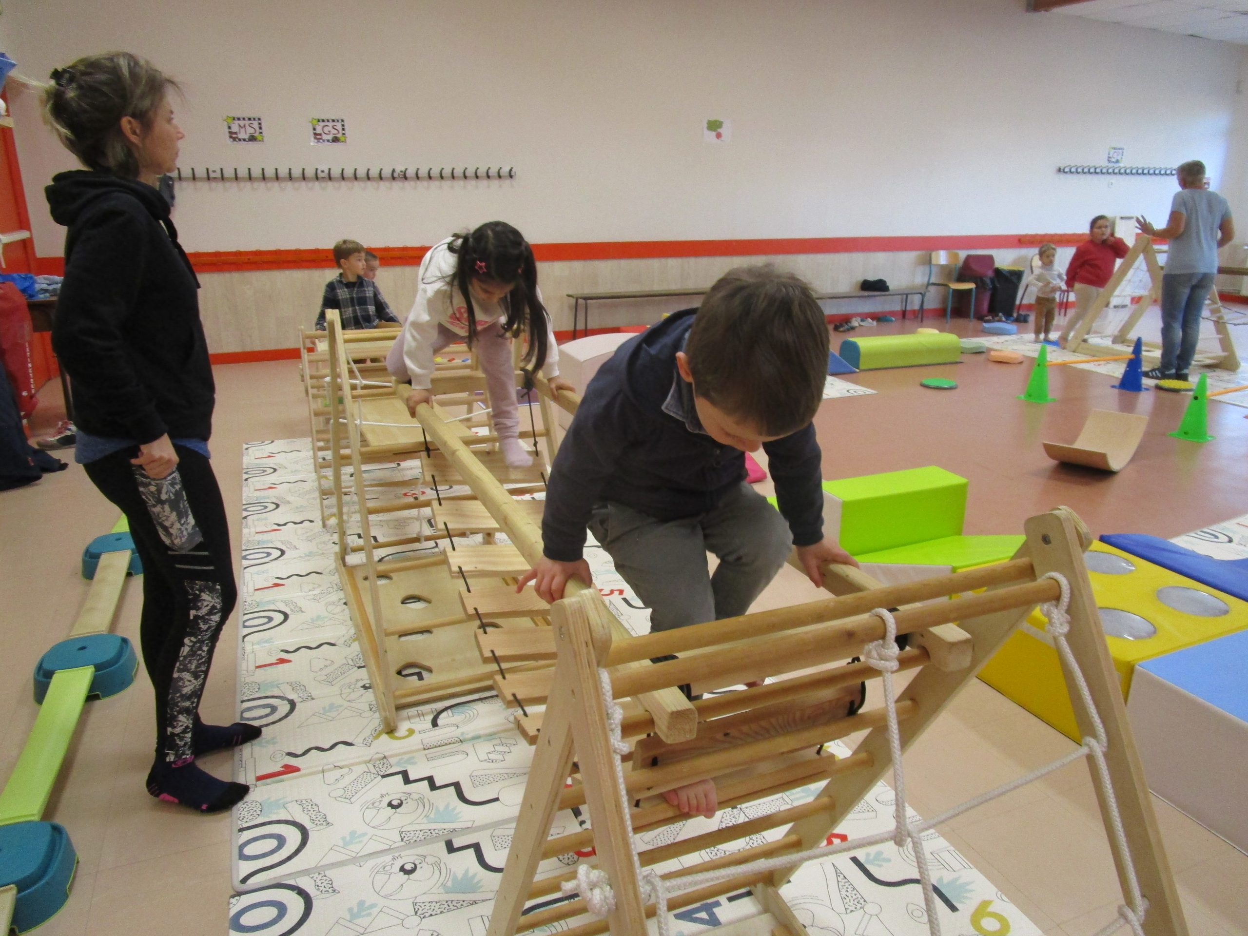 Nous avons la chance d’accueillir VALERIE, la maman d’ALIX, avec son parcours de motricité XXL. Quel plaisir de déambuler, grimper, rouler, escalader… pieds nus dans ces magnifiques structures aux multiples facettes : pont de singe, tunnel, espalier, poutres… Le plaisir des enfants était réel, très visiblement réel !!!