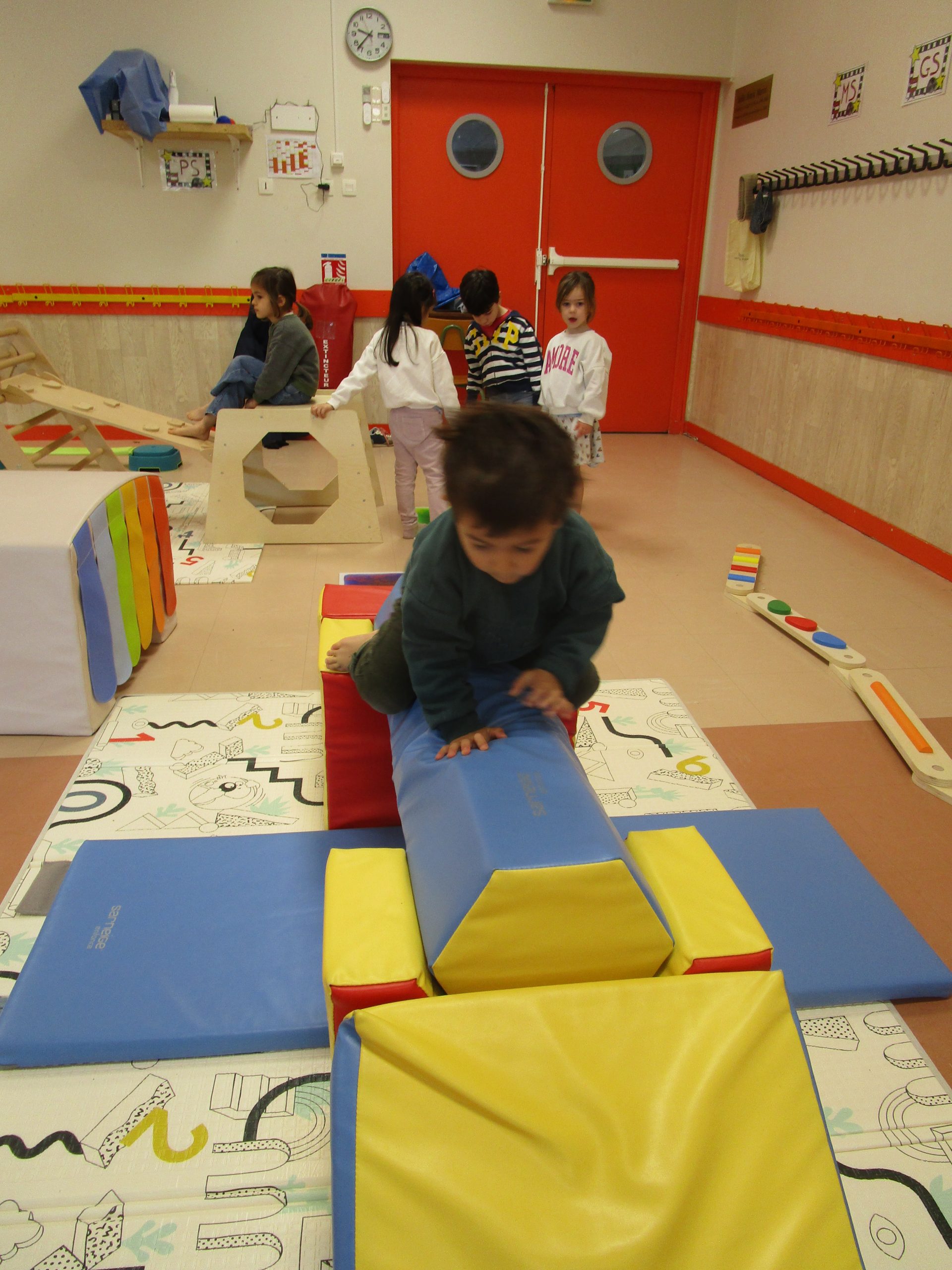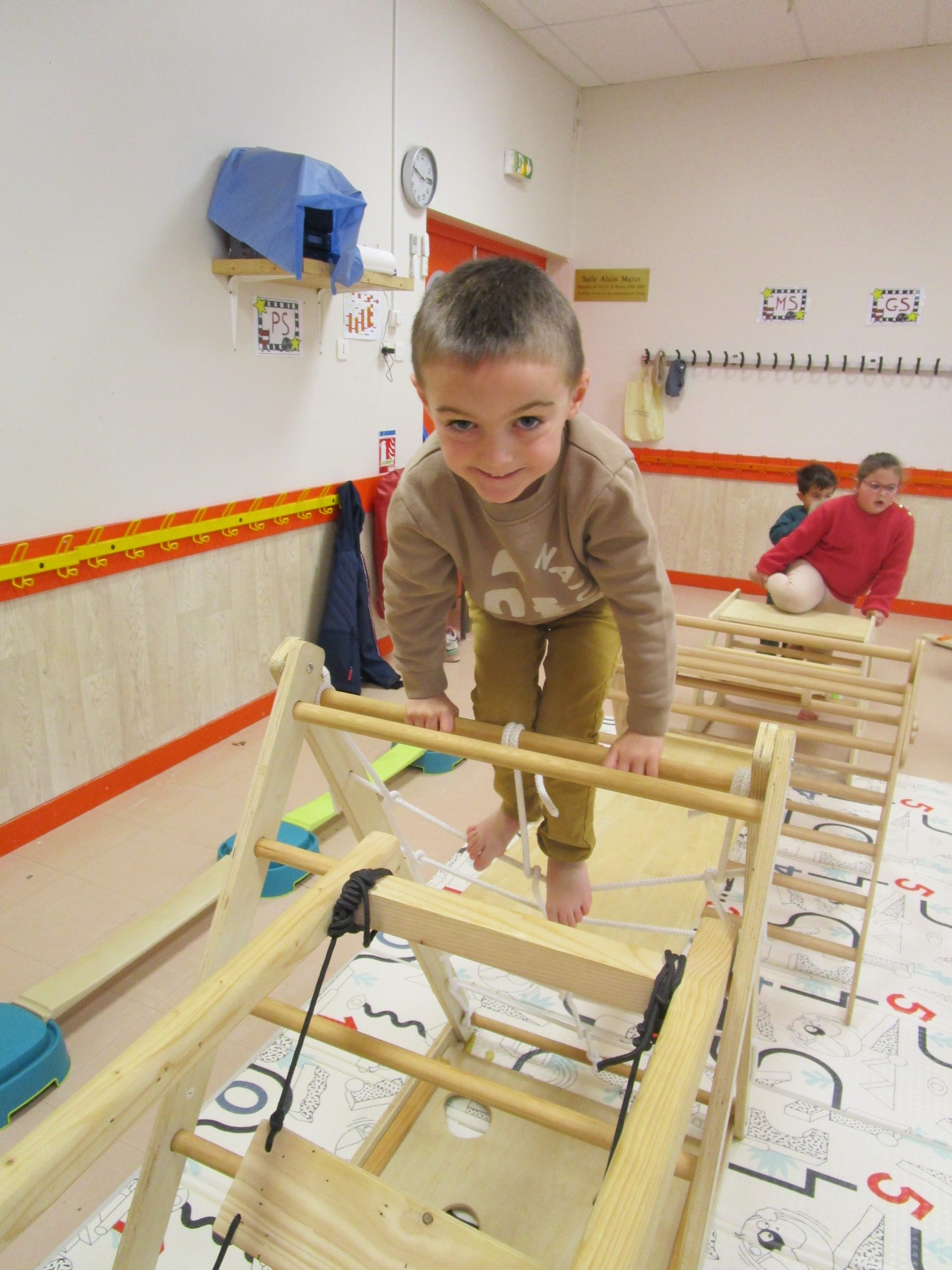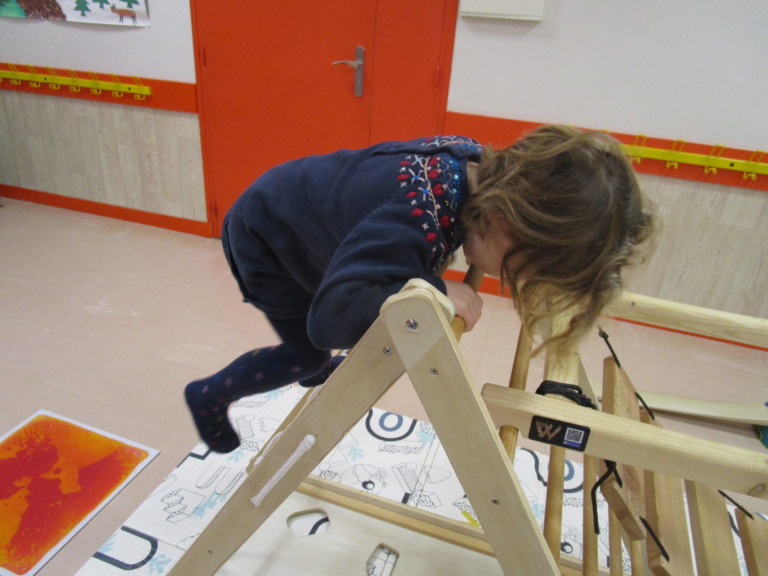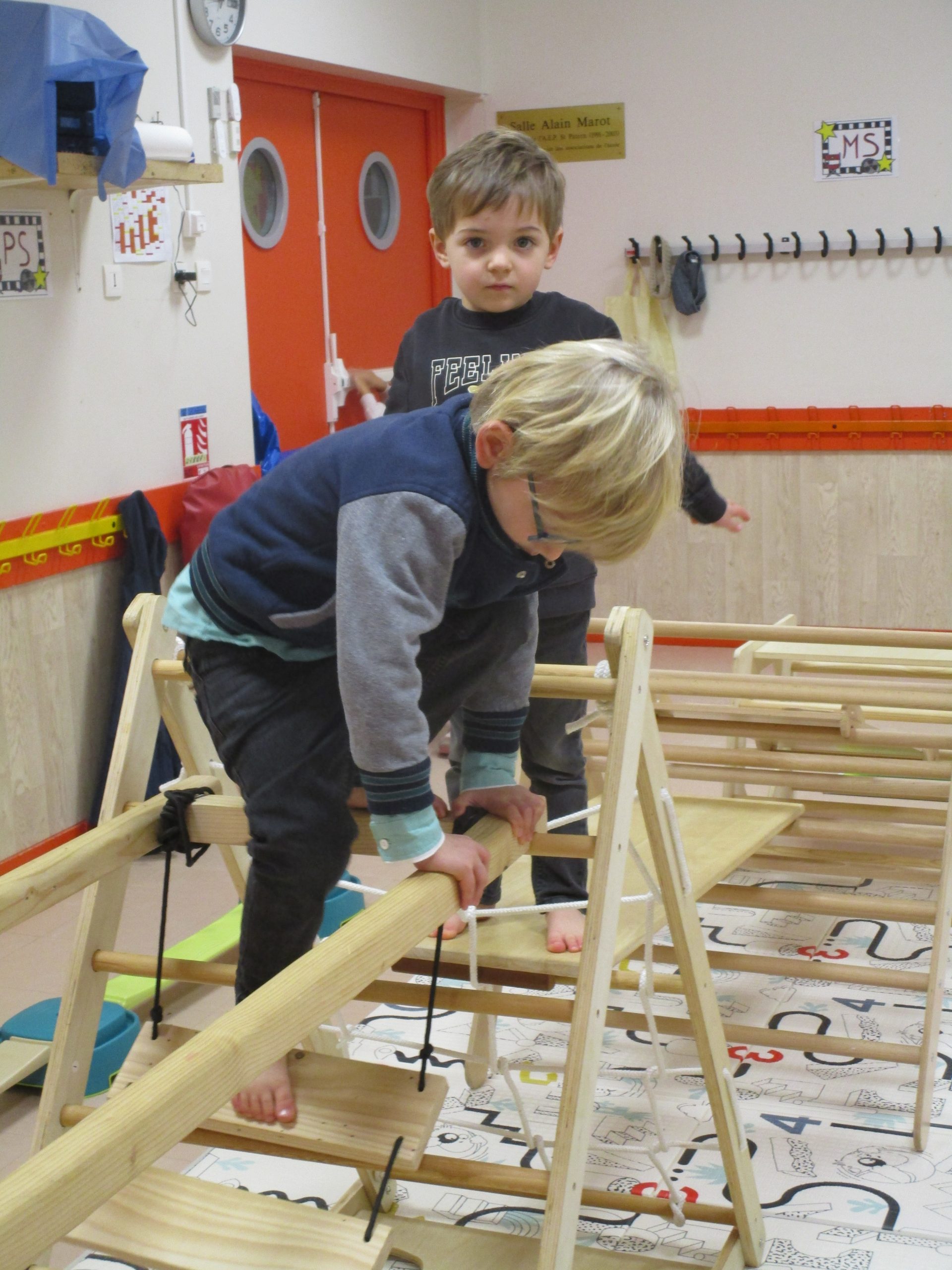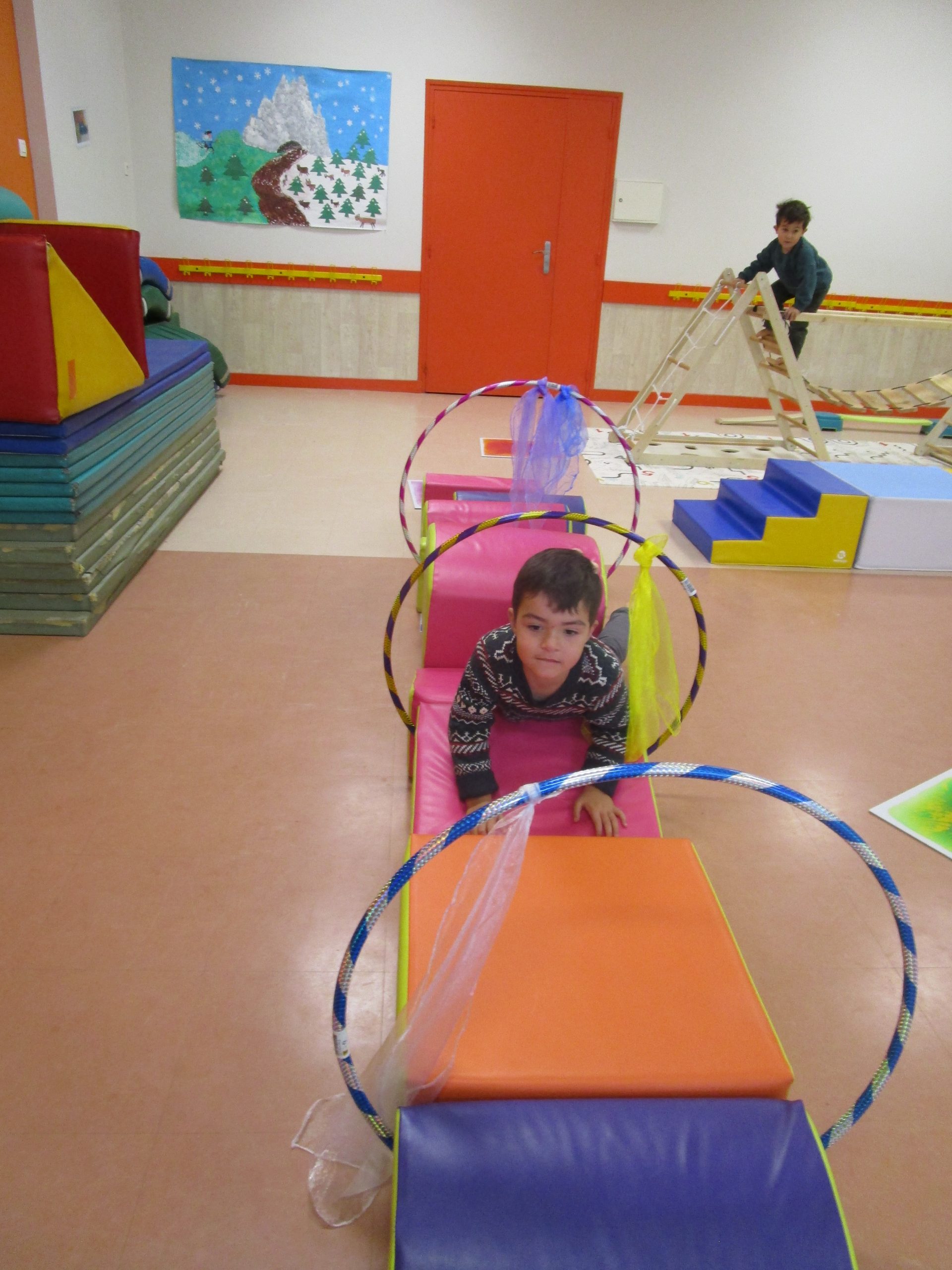 Nous avons la chance d’accueillir VALERIE, la maman d’ALIX, avec son parcours de motricité XXL. Quel plaisir de déambuler, grimper, rouler, escalader… pieds nus dans ces magnifiques structures aux multiples facettes : pont de singe, tunnel, espalier, poutres… Le plaisir des enfants était réel, très visiblement réel !!!