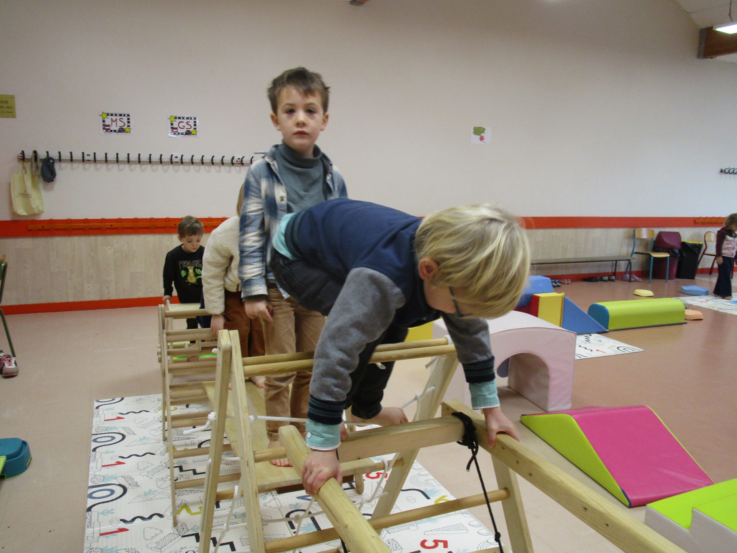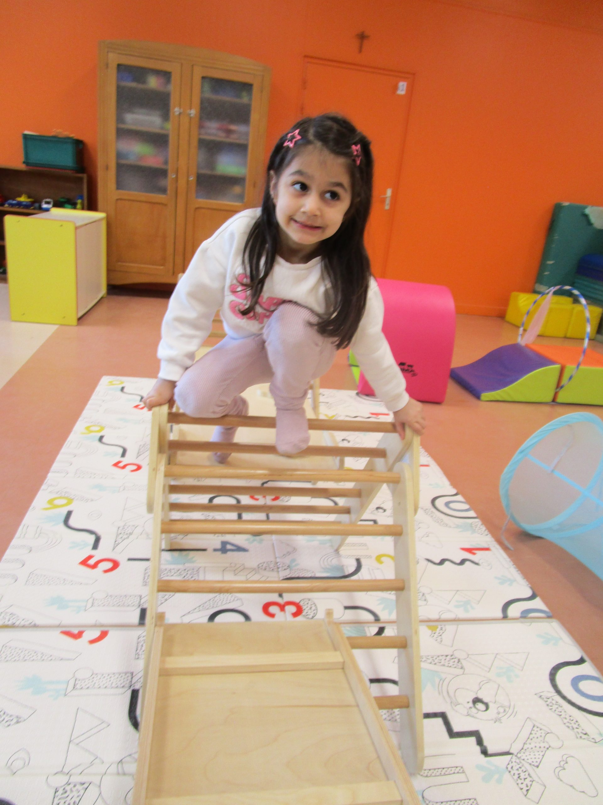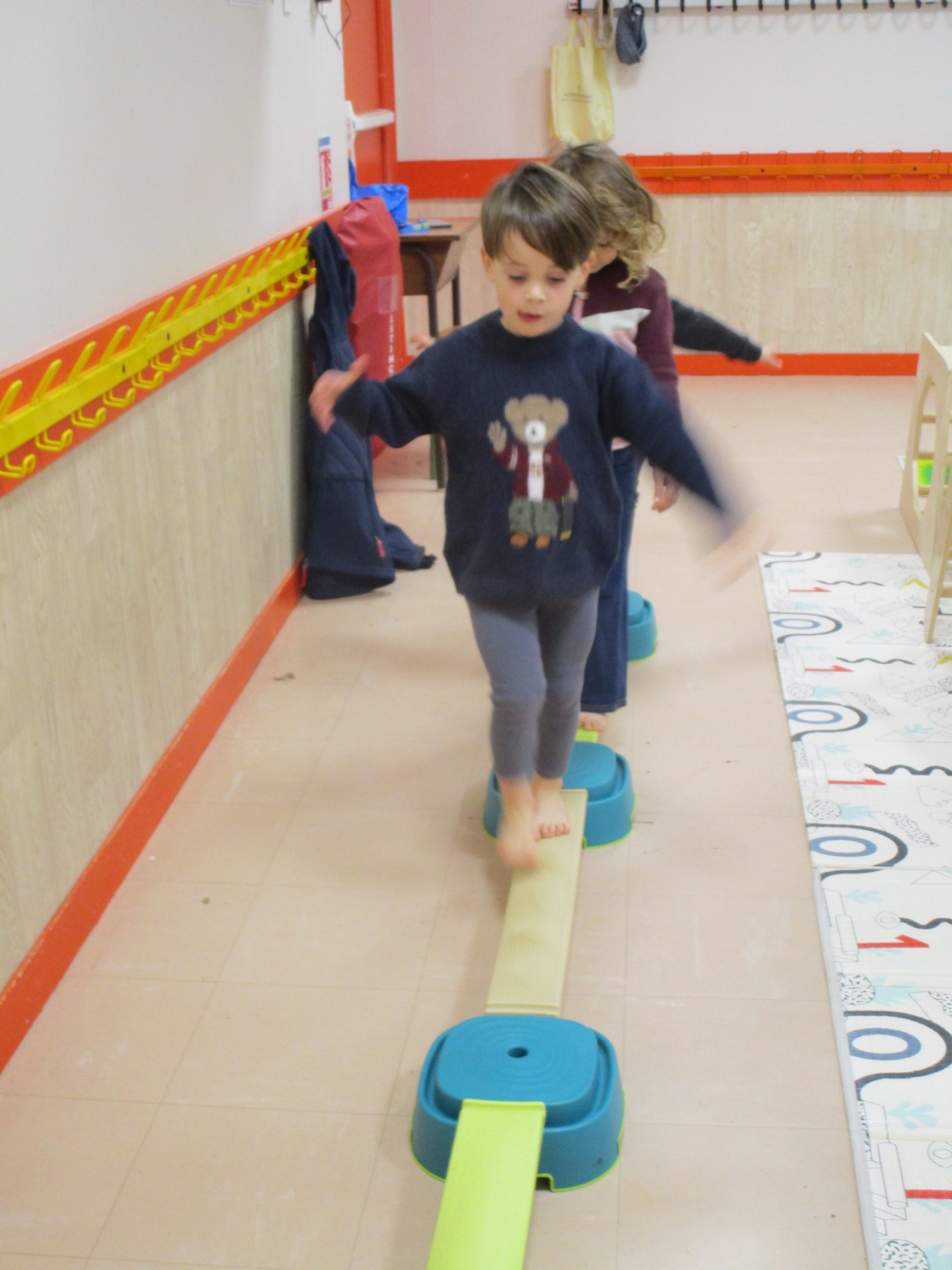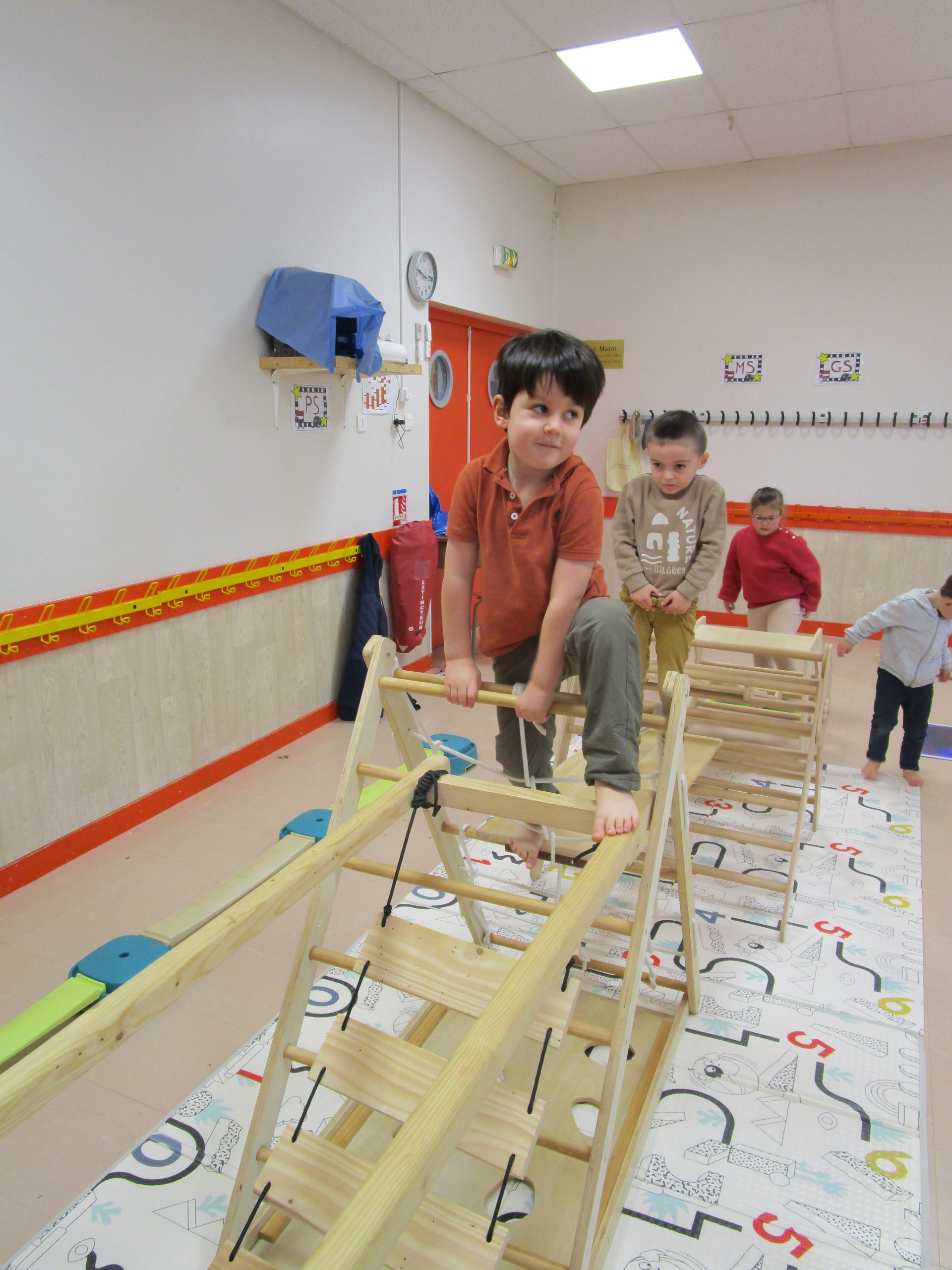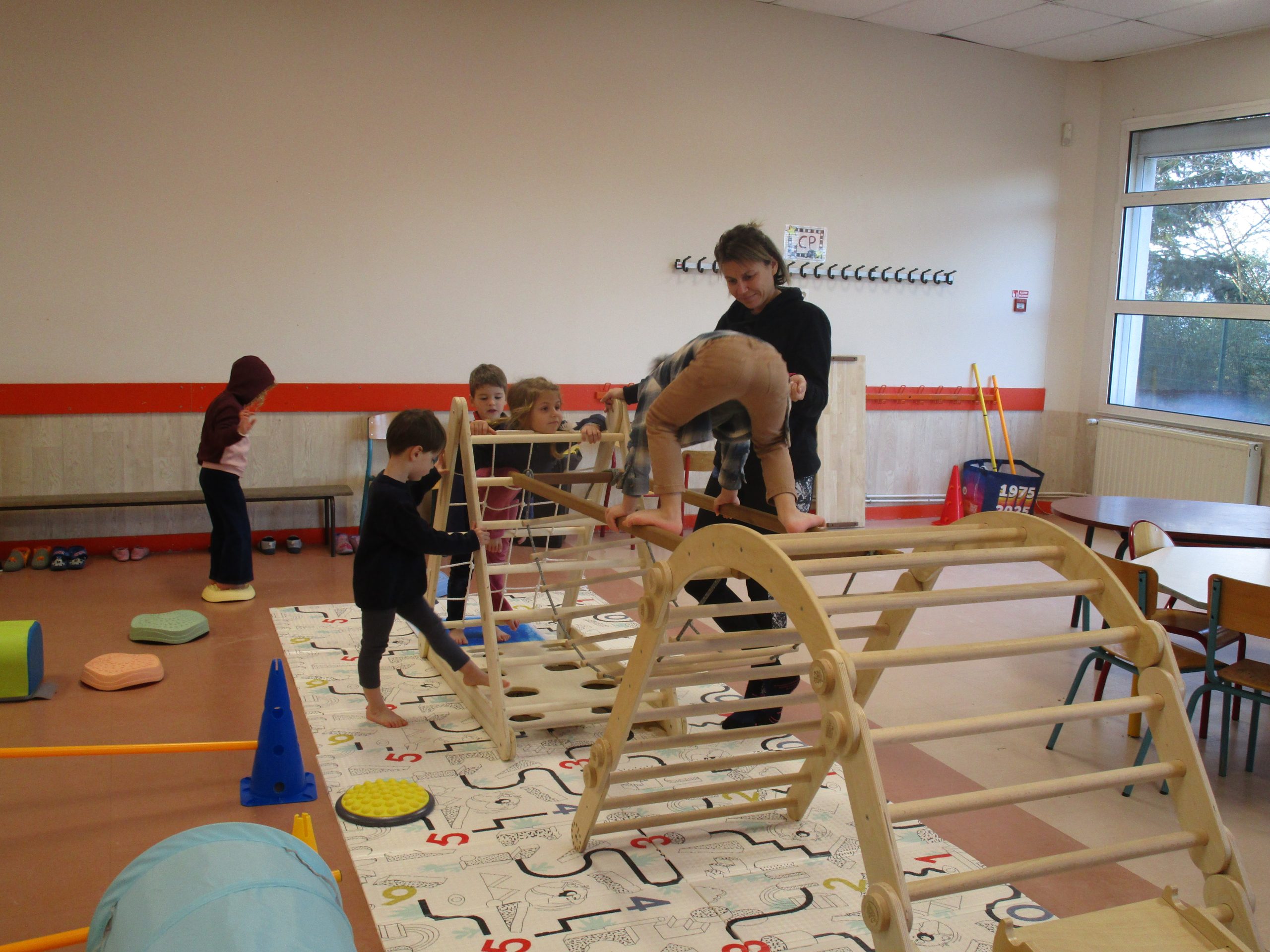 Nous avons la chance d’accueillir VALERIE, la maman d’ALIX, avec son parcours de motricité XXL. Quel plaisir de déambuler, grimper, rouler, escalader… pieds nus dans ces magnifiques structures aux multiples facettes : pont de singe, tunnel, espalier, poutres… Le plaisir des enfants était réel, très visiblement réel !!!
